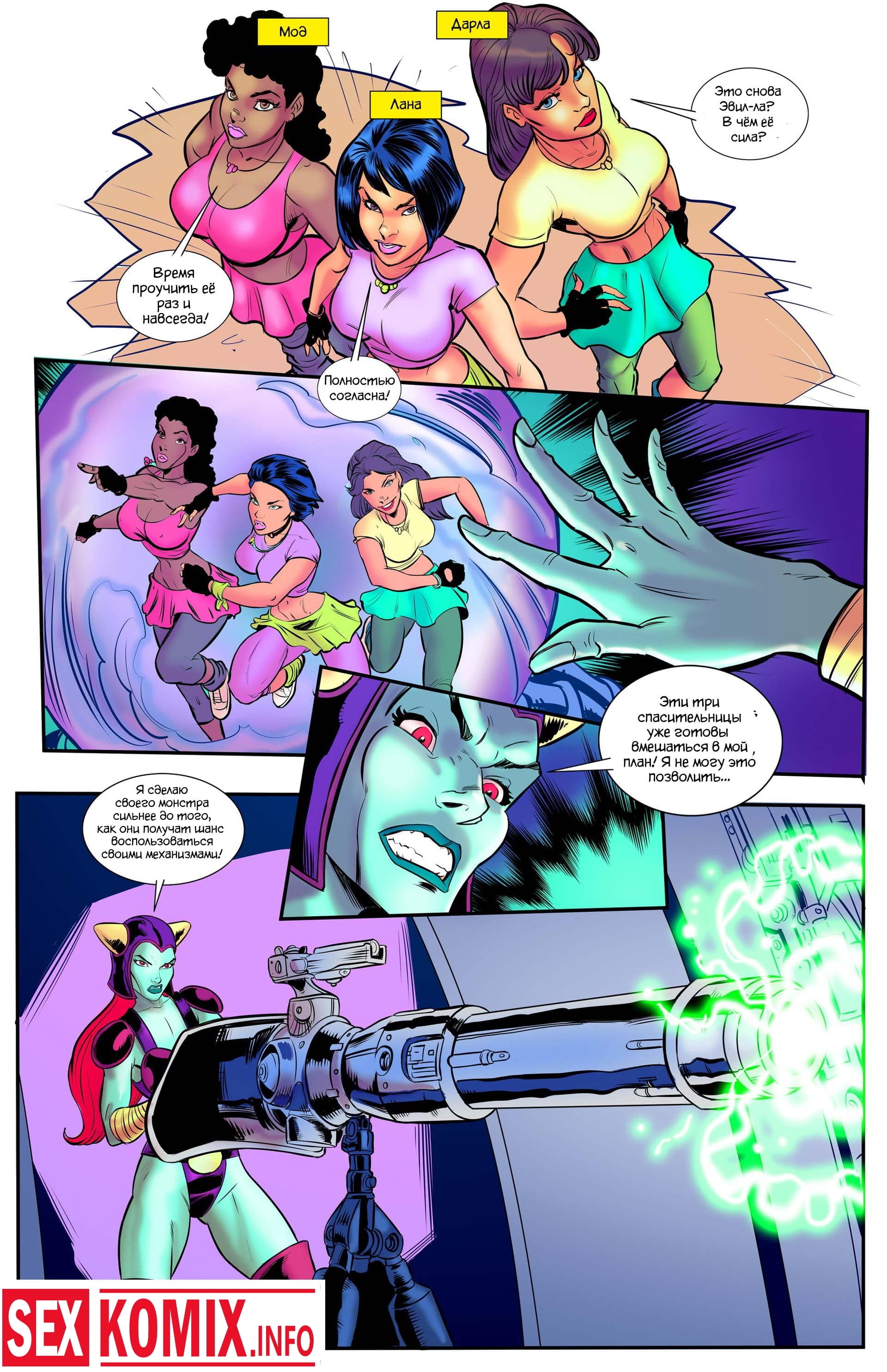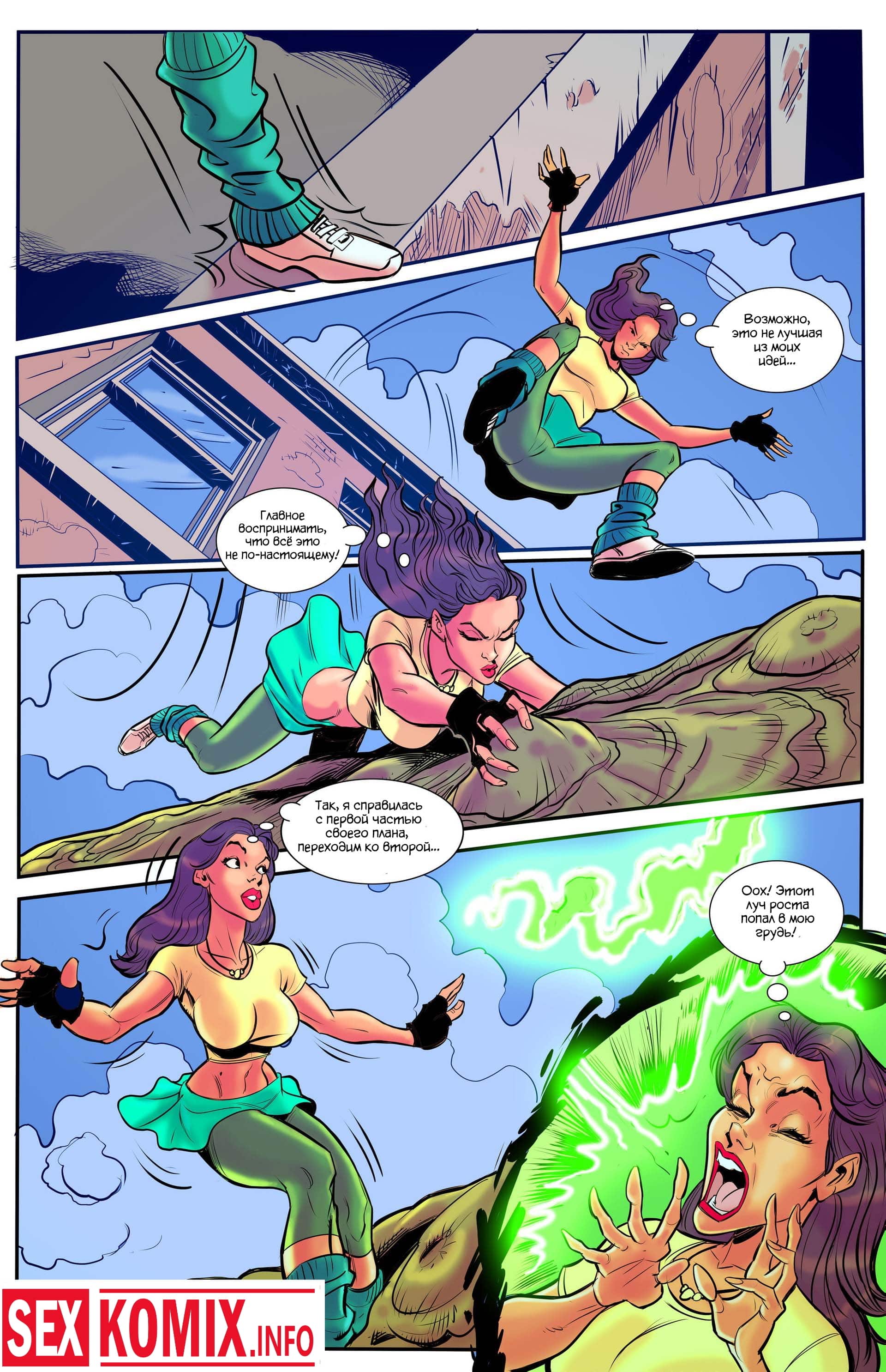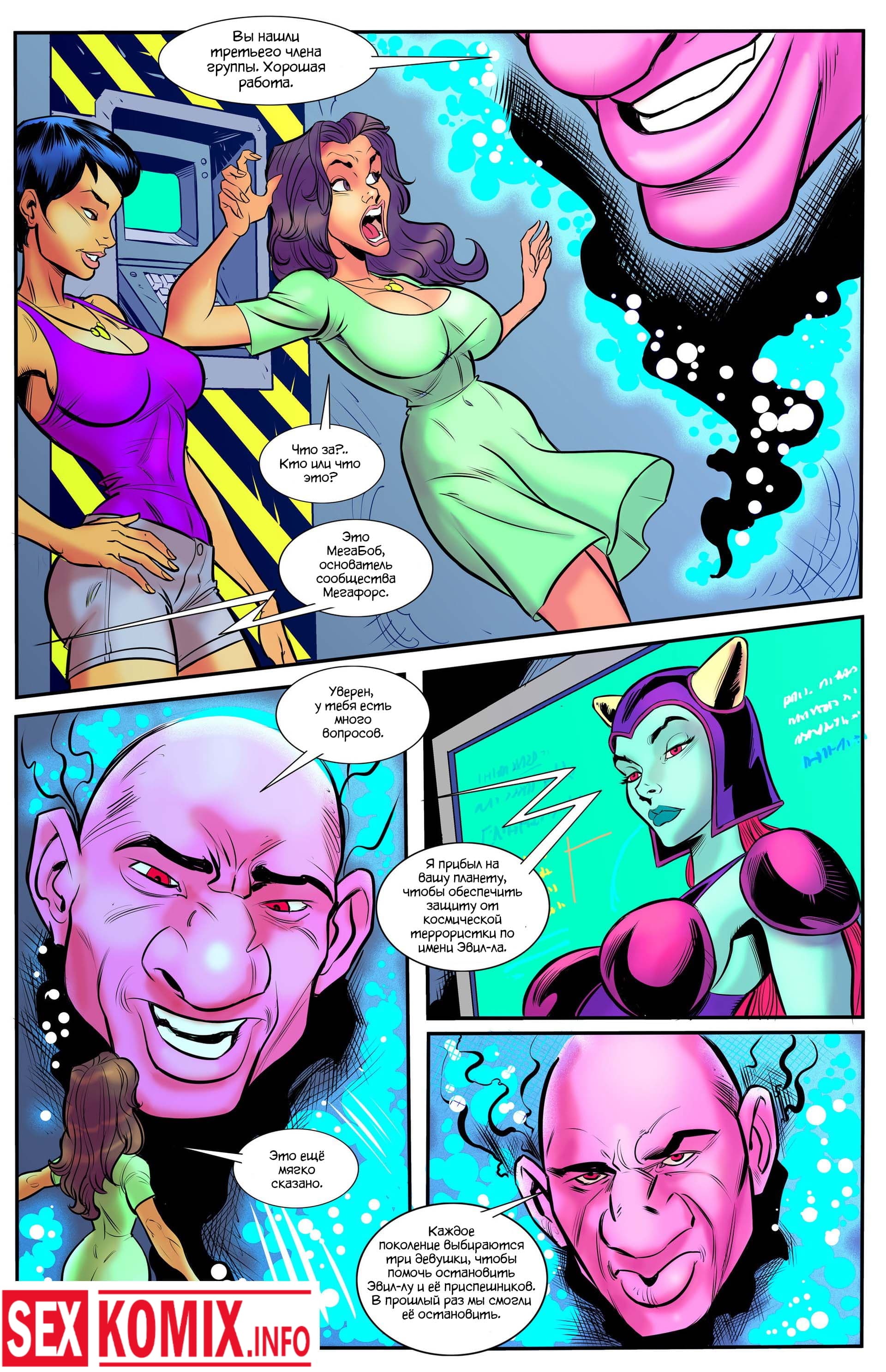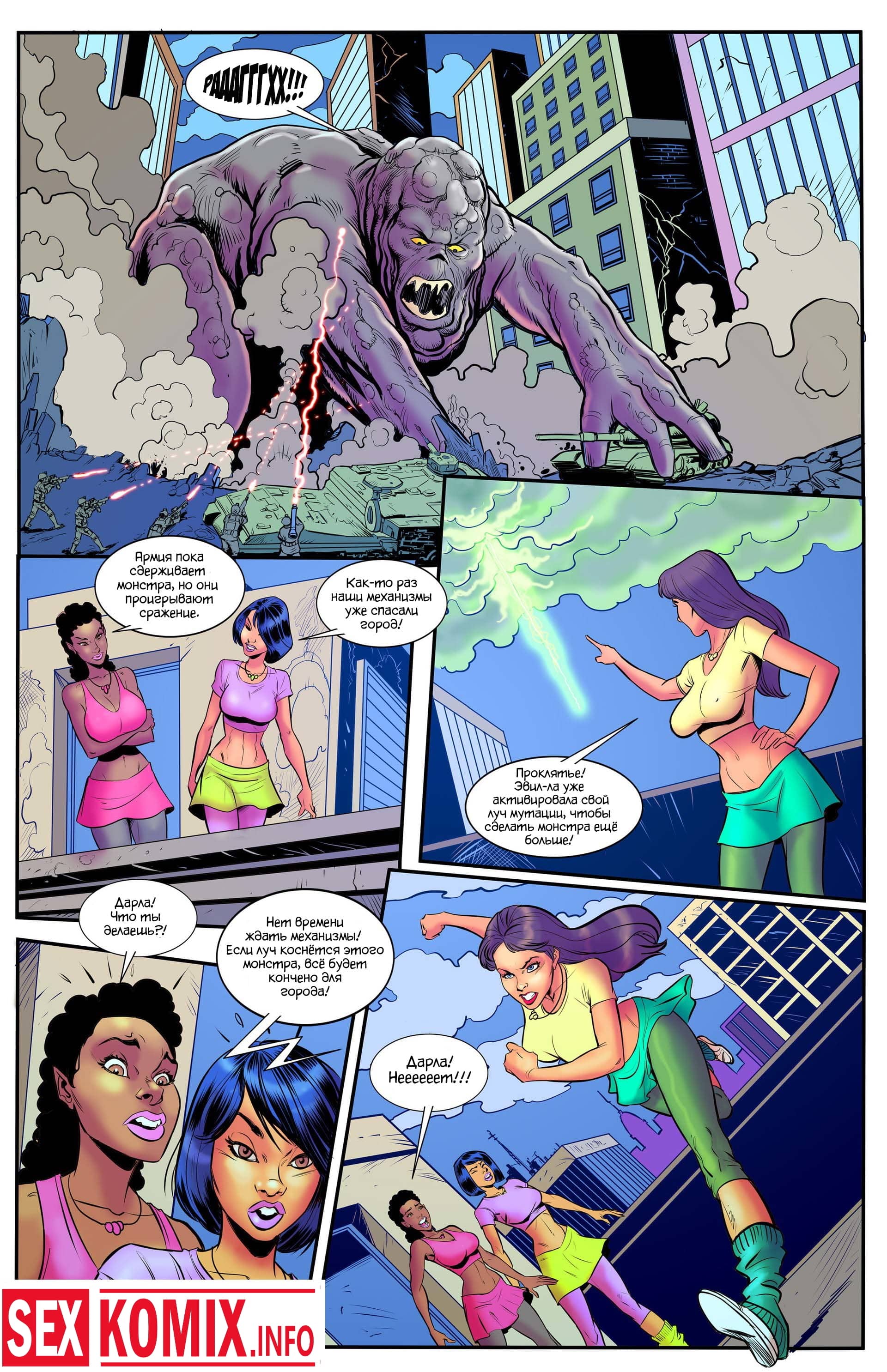 Порно комикс Мегафорс. Команда девушек с большими сиськами, обладающие супер способностями вступили в схватку с огромным грязевым монстром, который напал на город. Одна из этих красоток умеет становится гигантом она выросла до размеров здания и дала бой монстру. Вся одежда на ней порвалась, и девушка стала абсолютно голой, все жители города смотрели на огромную киску и большие сиськи.
