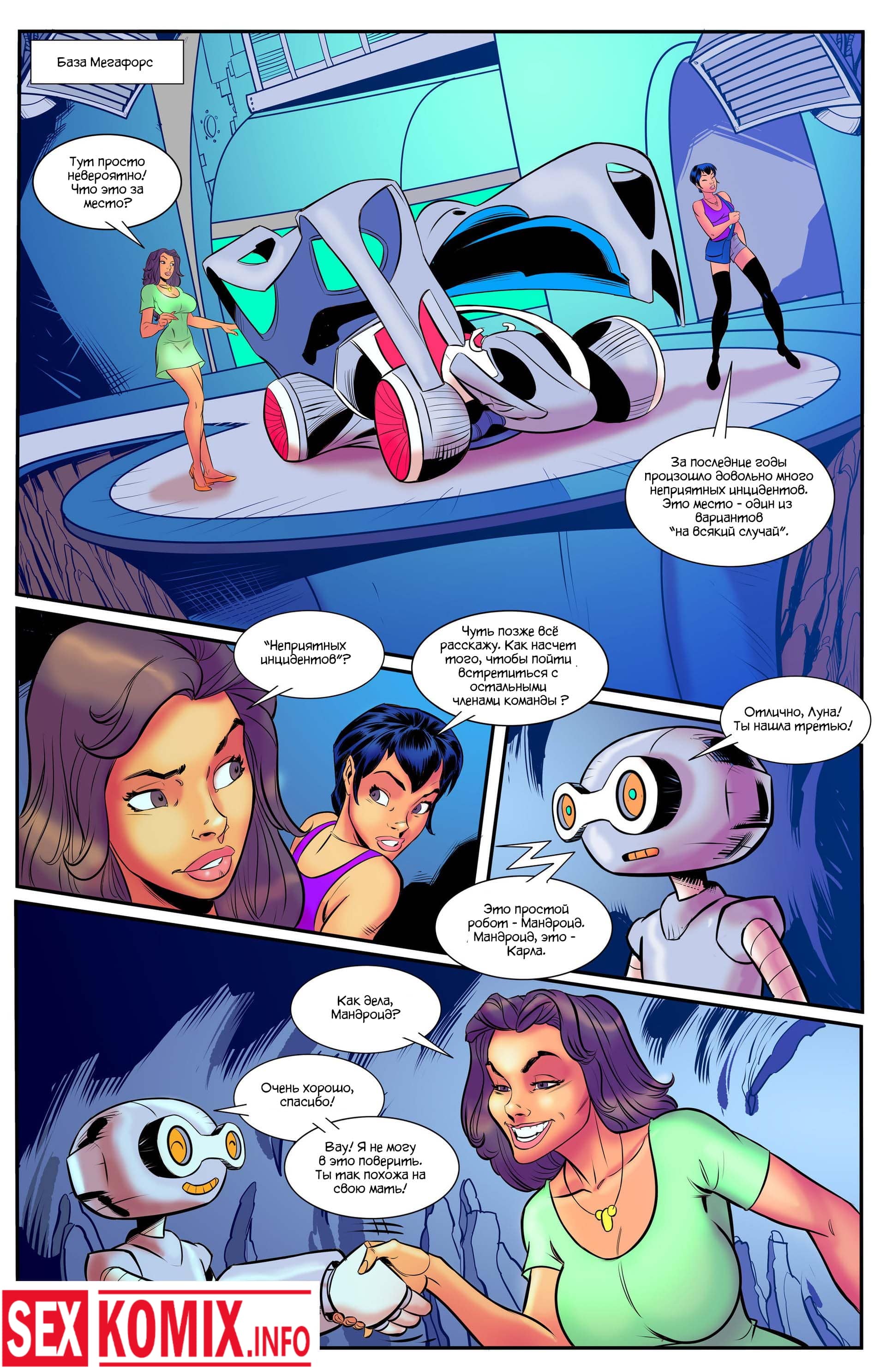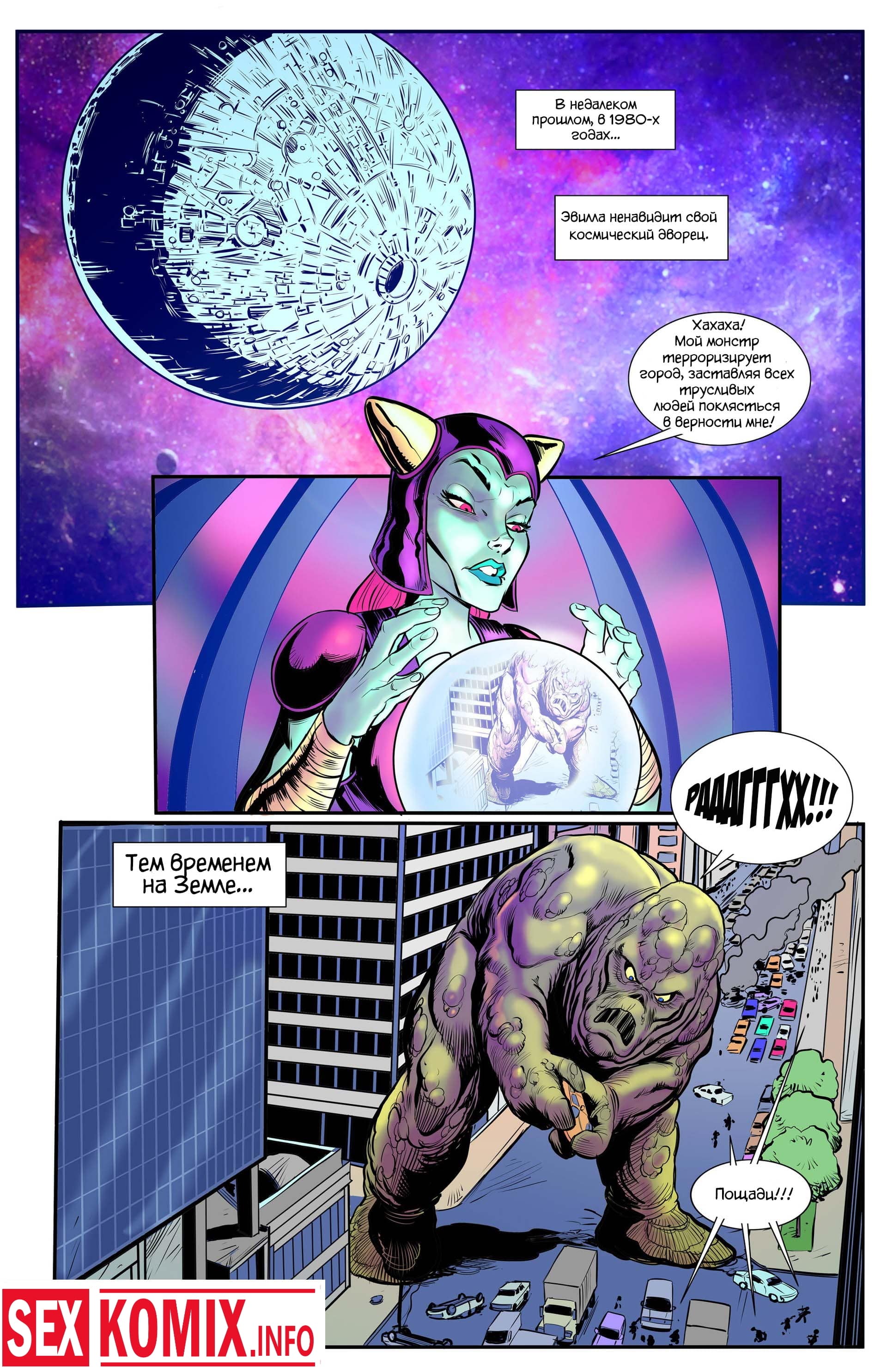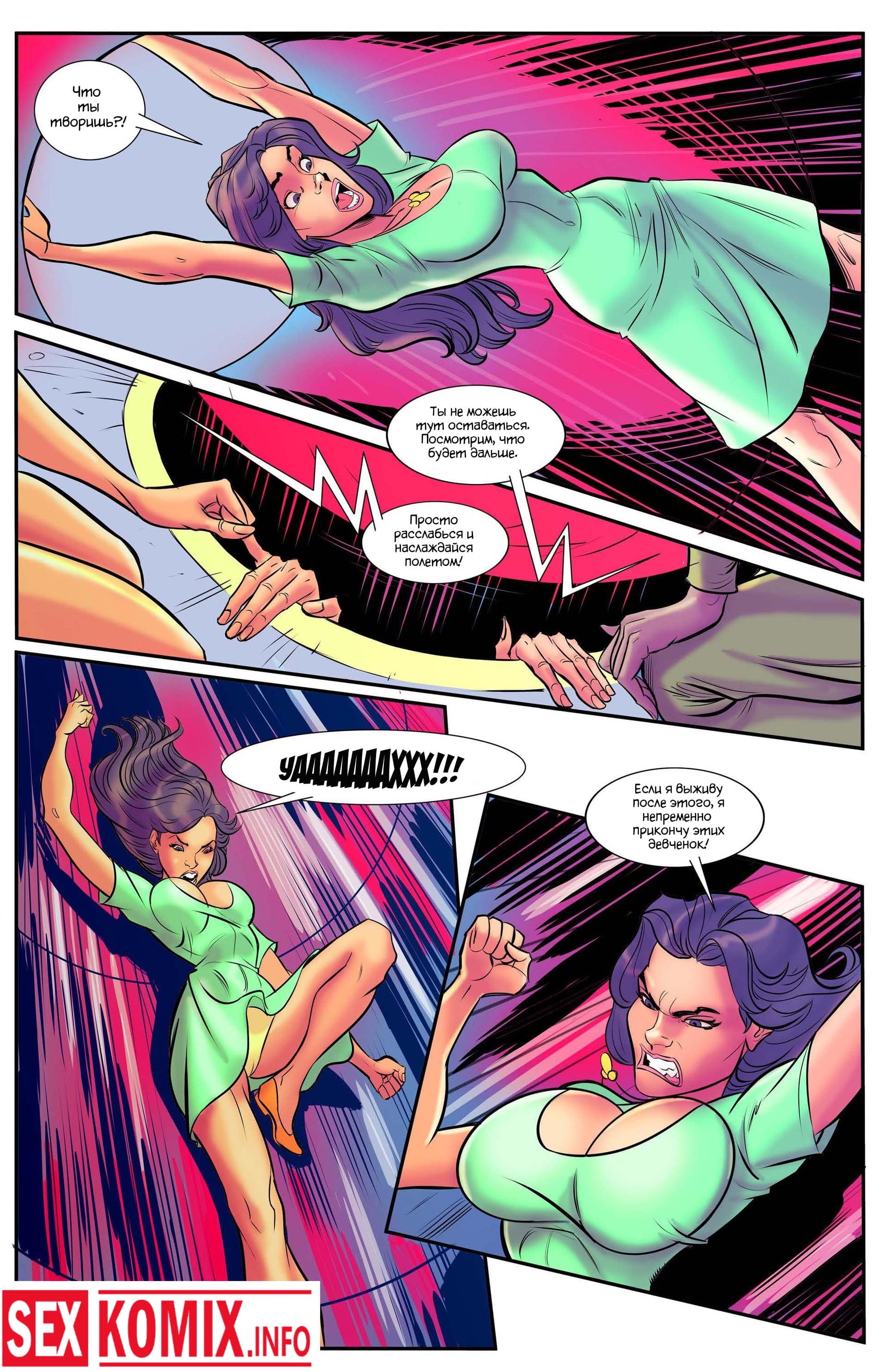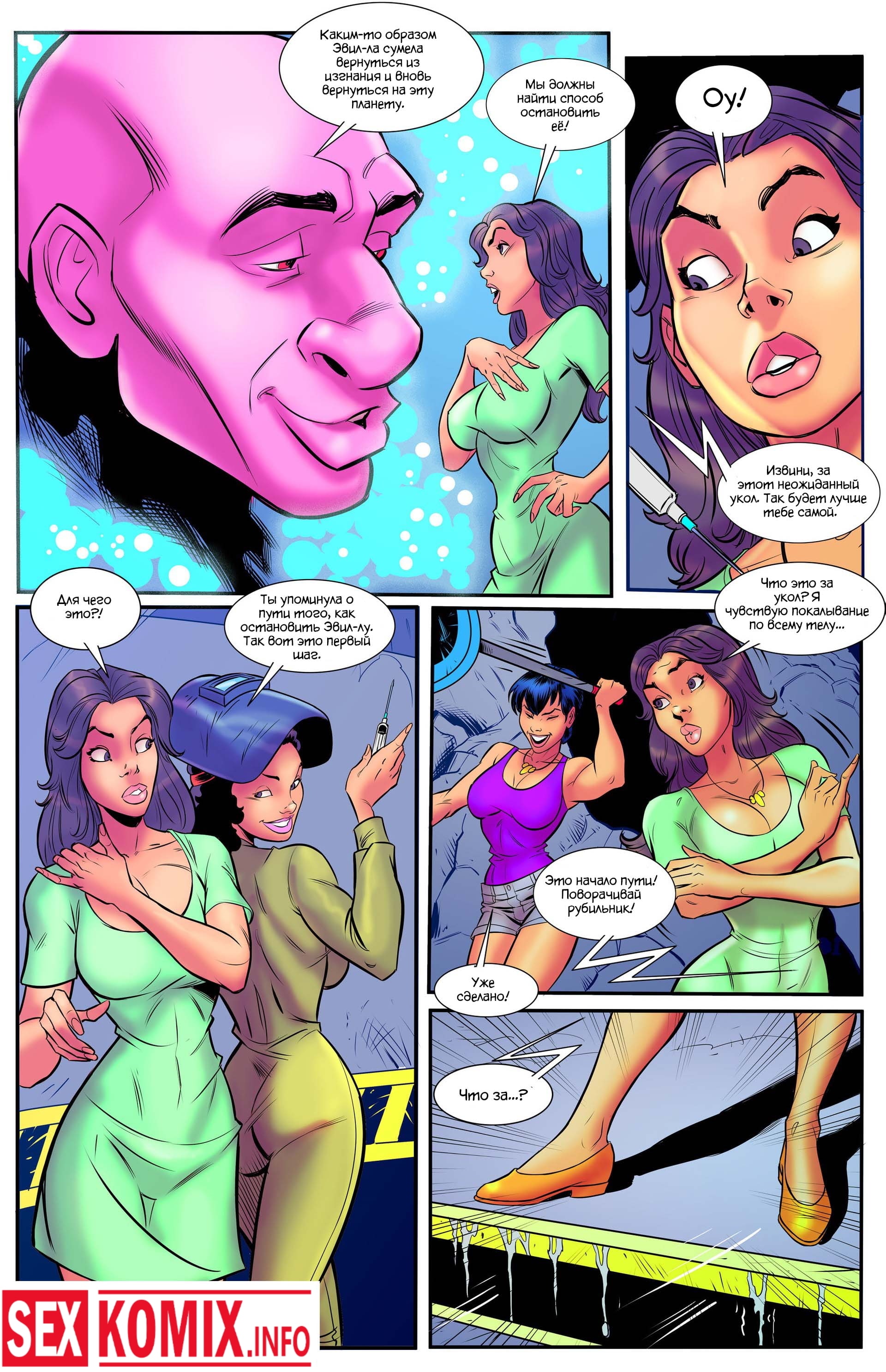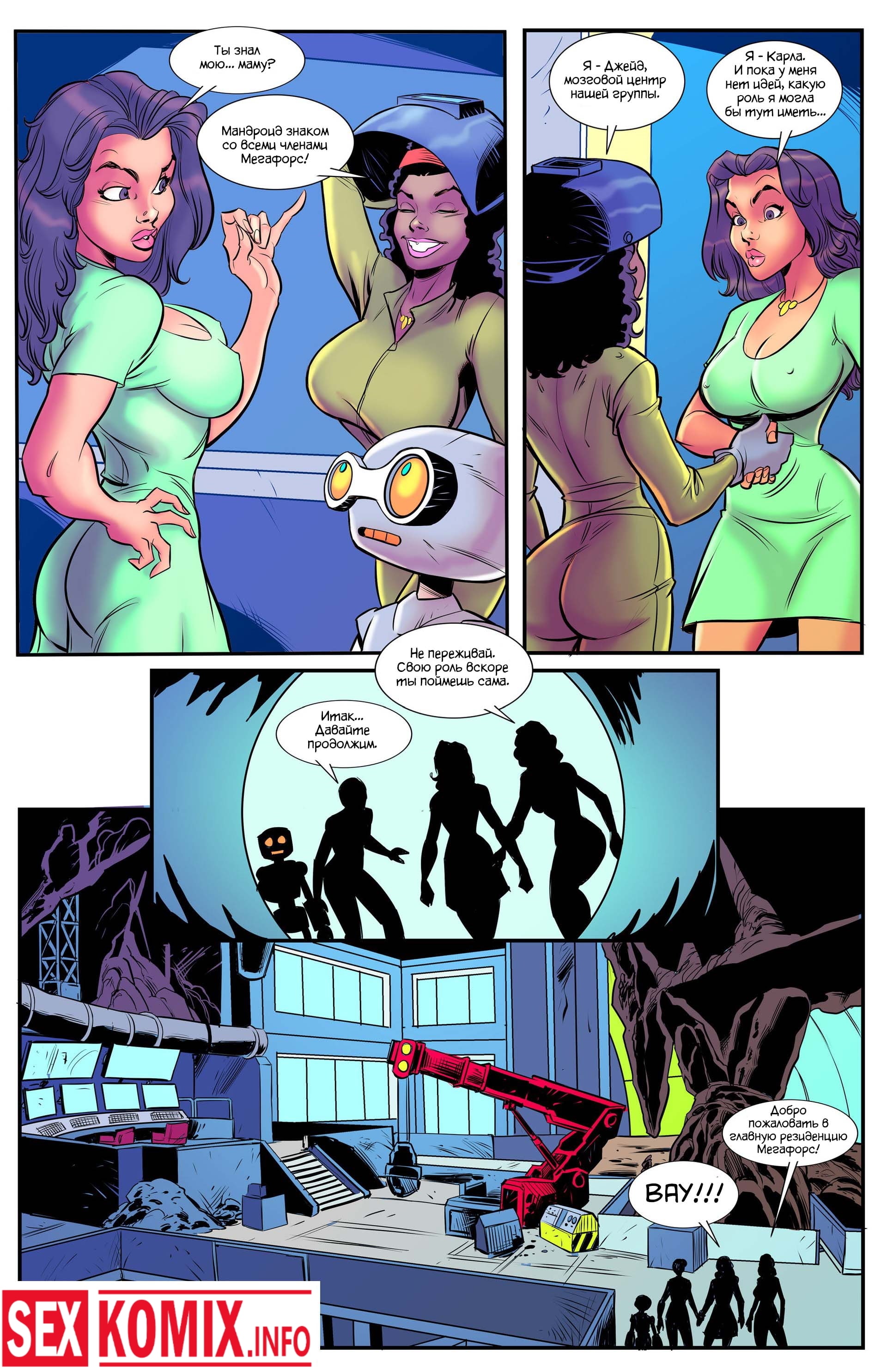 Порно комикс Мегафорс. Команда девушек с большими сиськами, обладающие супер способностями вступили в схватку с огромным грязевым монстром, который напал на город. Одна из этих красоток умеет становится гигантом она выросла до размеров здания и дала бой монстру. Вся одежда на ней порвалась, и девушка стала абсолютно голой, все жители города смотрели на огромную киску и большие сиськи.