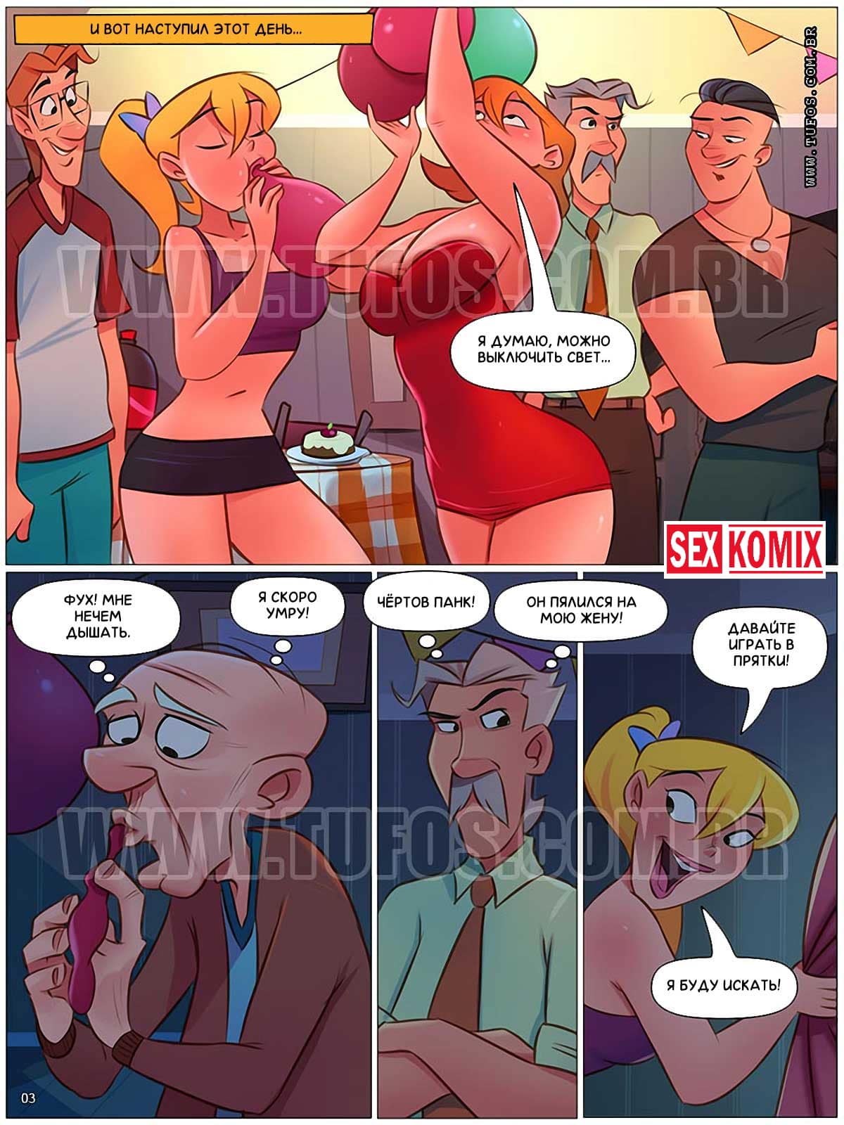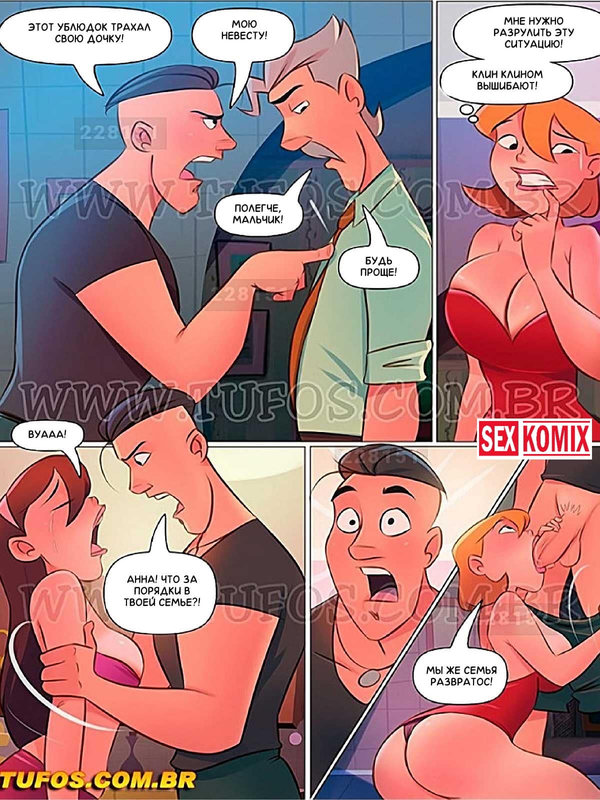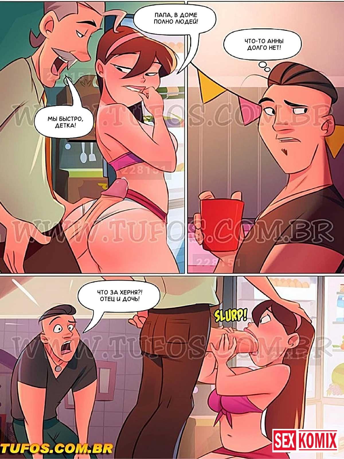 Порно комикс Похотливая семейка. Часть 64. Анне стукнуло 19. В семействе любителей инцеста праздник, дочери исполнилось 19 лет. Теперь она совсем взрослая и может официально заниматься сексом. Первым её решил отец, он достал член и красотка начала сосать его. В этот момент пришёл бойфренд девушки и удивился уведенным, он расстроился. Но его подбодрила сесуальная мать девушки, оголив свою пышную грудь. Женщина предложила трахнуть её и показала отличный секс, опыта ей не занимать.