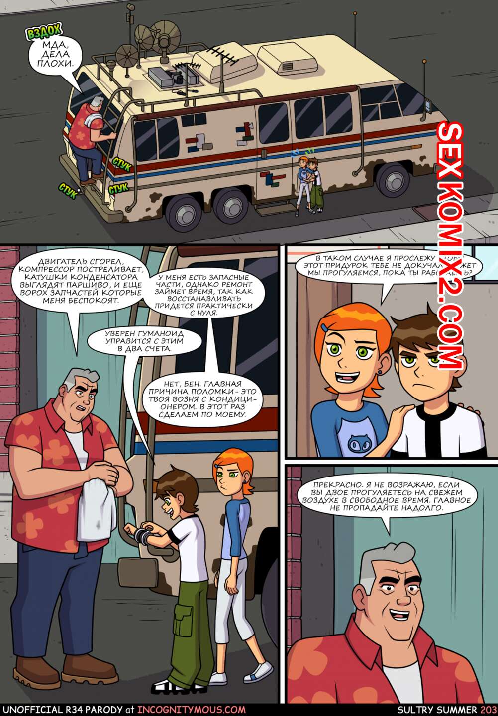 Порно комикс Знойное лето. Часть 2. Эпизод 2 Бен гулял по улице с Гвен и внезапно чертовски возбудился. Он завел девушку в переулок, чтобы повеселиться с ней. Он поставил сучку раком и хорошенько ее выебал, кончив ей в киску.