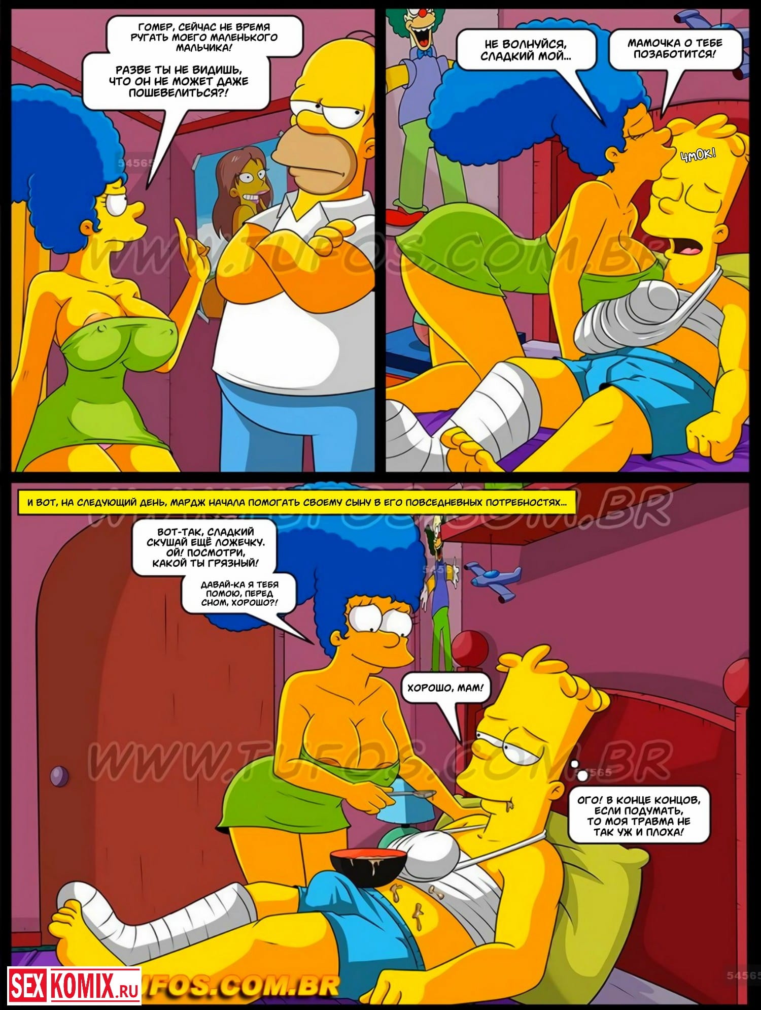 Порно комикс Симпсоны. Часть 11. Уход за больным сыном. Барт катался на скейтборде и на большой скорости упал. Он сломал руку и сильно повредил ногу, после нескольких дней в больнице парень вернулся домой и наконец то мог спокойно подрочить в одиночестве. Но не мог этого сделать, Мардж проходила мимо его комнаты и увидела как ему тяжело. Женщина решила помочь своему сыну получить удовольствие. Она сделала Барту минет, а потом села на его член своей сочной киской.