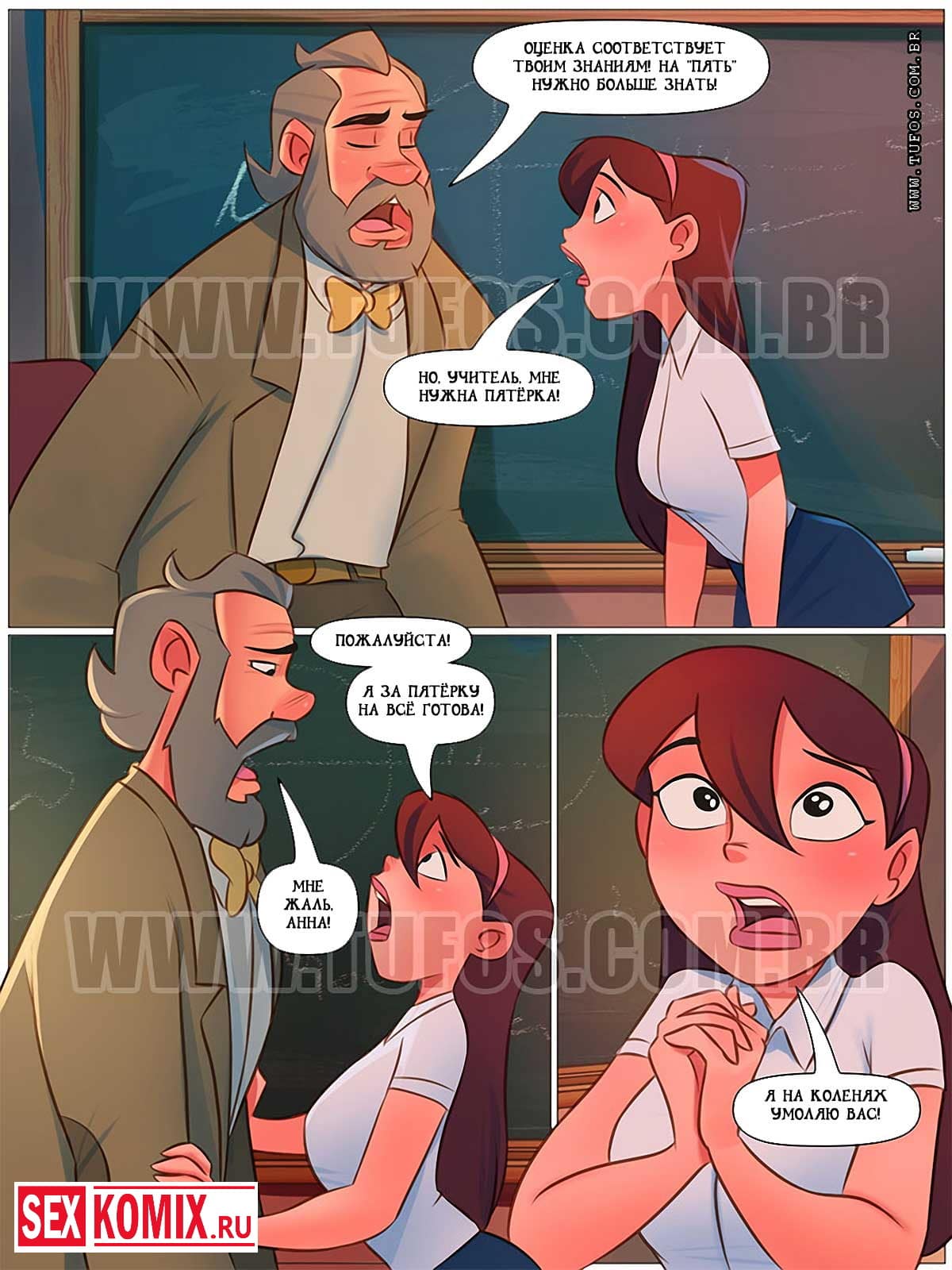 Порно комикс Похотливая семейка. Часть 61. Тройка с минусом. Развратная студентка не могла сдать экзамен и решила воспользоваться другим методом для достижения этой цели. Она попыталась соблазнить своего преподавателя. Аппетитная девушка зашла в аудиторию, когда он был там один и начала крутить перед ним своей симпатичная попкой, и наклоняться, чтобы она выглядывала из-под коротенькой юбочки. Профессор возбудился от такого представления, и решил узнать причину такого поведения. Девушка сказала, что сделает ему отличный минет и разрешить трахнуть себя за то, что он поставит ей хорошую оценку за экзамен, мужчина не смог отказаться от такого заманчивого предложения. Он с радостью трахнул свою студентку.