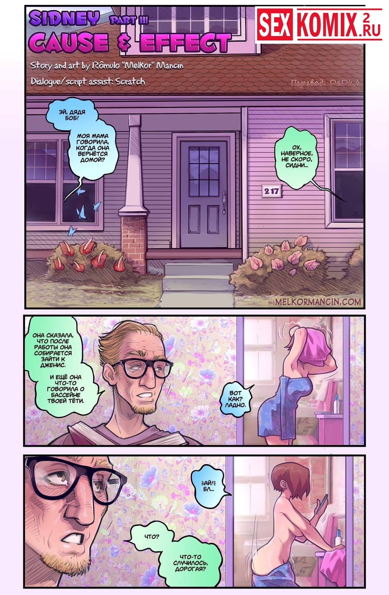 Порно комикс Сидни. Часть 3. Как аукнется, так и откликнется. Дядя со своей племянницей сидят дома и играют. Но мужчина предложил поиграть в кое что поинтересней. Девушка заинтересовалось новой игрой, она очень любит играть. И дядя начал рассказывать правила. Нужно, чтобы она достала его член из штанов и немного его потерла ручками, после этого его нужно взять в рот и начинать сосать. А мужчина в свою очередь должен оголить пышную грудь и сжав её сиськи, целовать соски. Девушке очень понравилась эта игра и она хотела продолжения. Самое интересное и развязка это увлекательной игры ждет вас в этом порно комиксе.