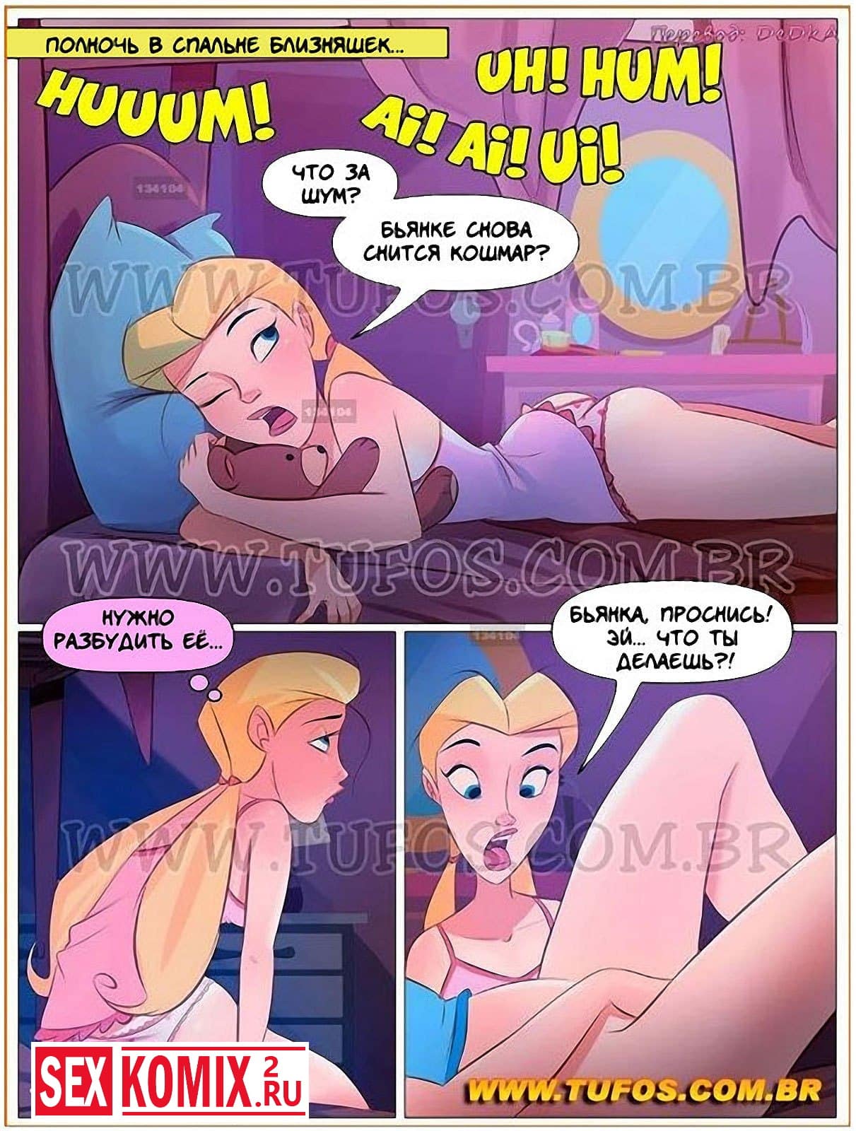 Порно комикс Семья Распутос. Часть 4. Одна ночь близняшек. Эта часть данного произведения поведает вам о том, как сёстры-близнецы были очень похожи внешне, но вели себя совершенно по-разному. Одна вела себя, совершенно естественно, то есть, как шлюха, а вторая старалась выглядеть скромницей и недотрогой. Однажды ночью та из них, которая не скрывала свою похотливость, решила проверить, действительно ли её сестра такая «святоша», или только прикидывается. Она залезла к ней под одеяло, спустила её трусики и засунули пальчик в её киску.