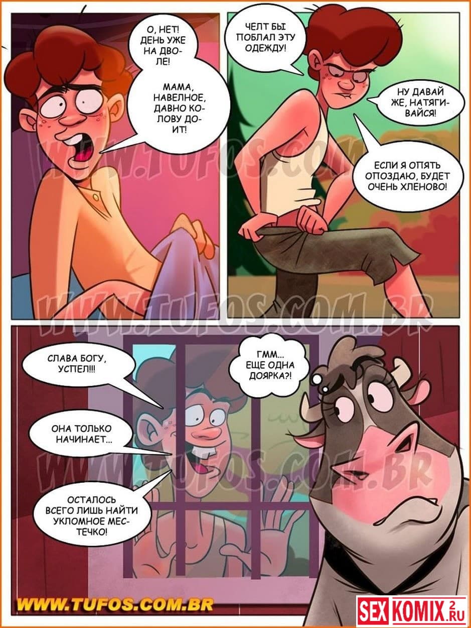 Порно комикс Деревенская семейка. Часть 7. Дойка Мимозы. Вы узнаете, что парень часто шпионил за мамашей, когда та шла доить корову. Как вы уже догадались, его интересовал не сам процесс дойки, а аппетитный зад женщины, который было прекрасно видно во время сцеживания молока. И вот в очередной раз, парень смотрел на свою сочную мамашу и дрочил за углом. Но мать его заметила, и подозвала к себе поближе, она не стала его ругать, а наоборот захотела подоить его. Она взяла в руки его член и хорошенько его отработала.