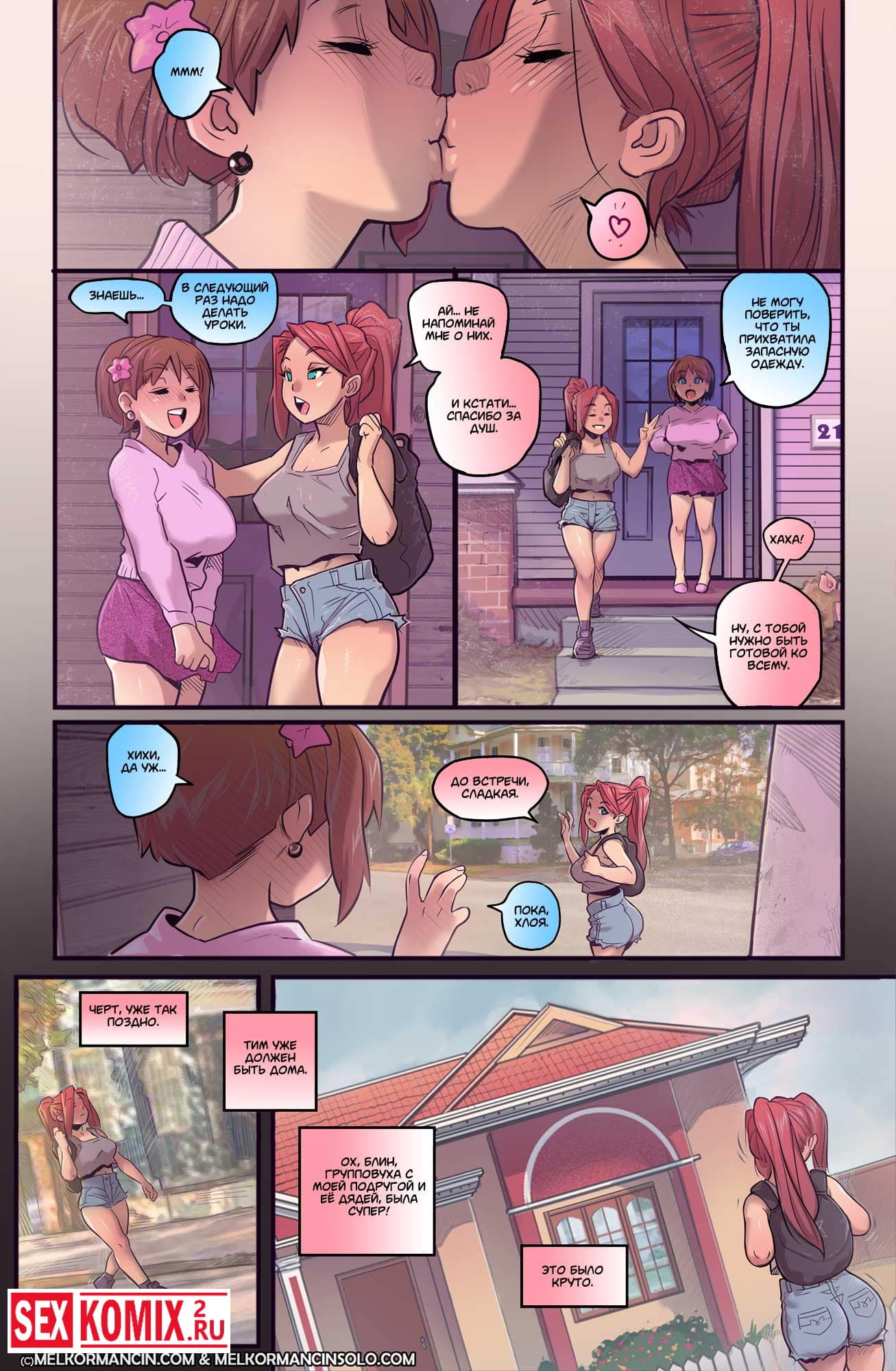 Порно комикс Сидни и Хлоя. Часть 4. Твой дядя Боб. Развратная Хлоя пришла в гости к своей подруге Сидни, они валялись в её комнате и ничего не делали. Хлоя вспомнила случай, когда она пришла в гости к ней и через окно увидела, что эта сексуальная красотка занималась сексом со своим дядей Бобом. Сидни застеснялась, но всё же согласилась рассказать подробности той истории. От сексуального рассказа Хлоя начала возбуждаться, ей захотелось поиграть с сиськами Сидни и поцеловаться с ней. Когда девушки уже были голые, в комнату зашёл тот самый дядя Боб и присоединился к ним.