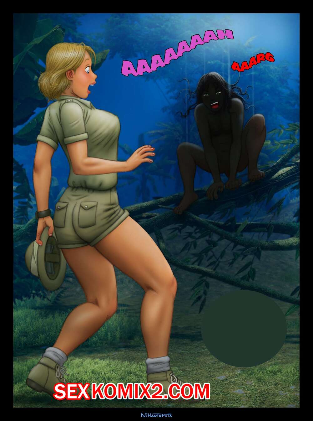 Порно комикс В джунглях. Lost. Nihaotomita Сисястая блондинка милфа заблудилась вечером в джунглях и столкнулась с молодым темнокожим парнем. Он стал ласкать ее сиськи, после чего хорошенько выебал ее своим большим хуем и кончил в нее.