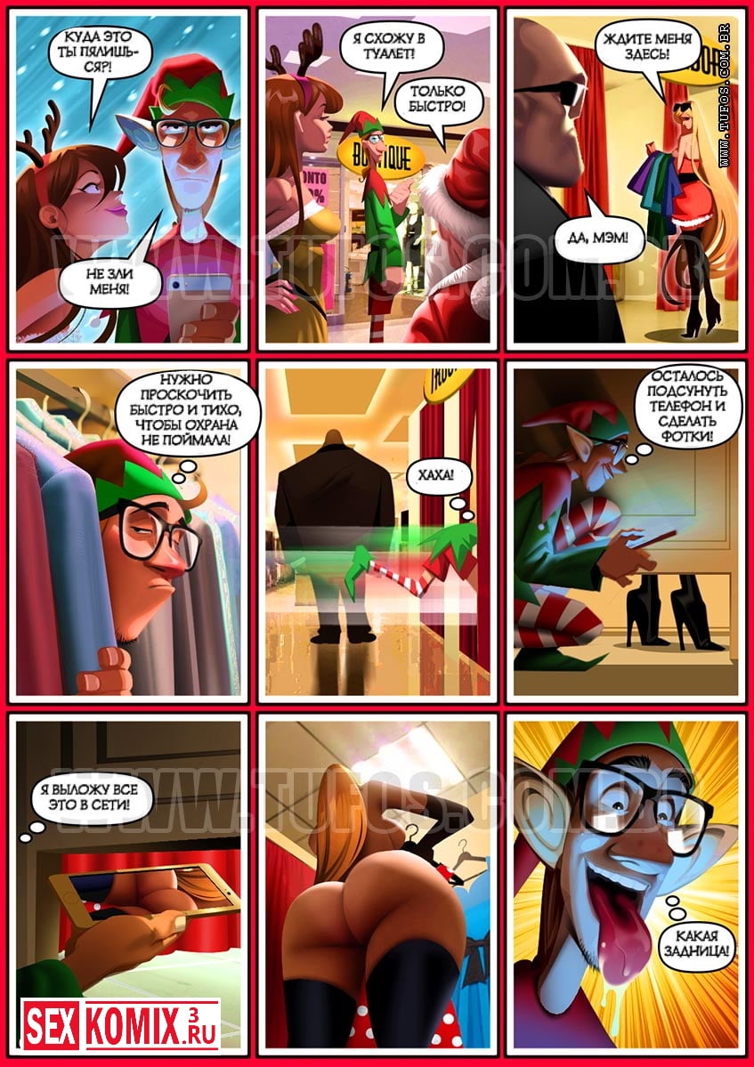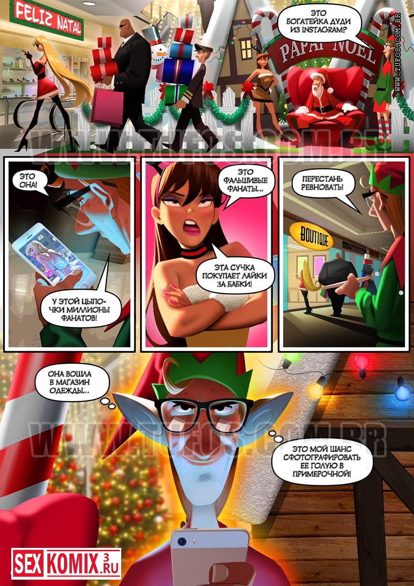 Порно комикс Семейка богатеев. Часть 7. Рождество с семейкой Развратос. Карлос смог получить работу Санты в торговом центре и взял с собой Анину и Крлитоса. Пока они стояли у ёлки мимо прошла горячая блондинка и Карлитос узнал в ней, Инстаграм модель на которую он не раз дрочил дома. Парень решил за ней проследить и проник в соседнюю кабинку примерочной, а когда красотка разделась начал её фотографировать просунув телефон снизу. Но девушка его заметила, она не разозлилась, а наоборот предложила сделать её анилингус, на что Крлитос с большой радостью согласился.