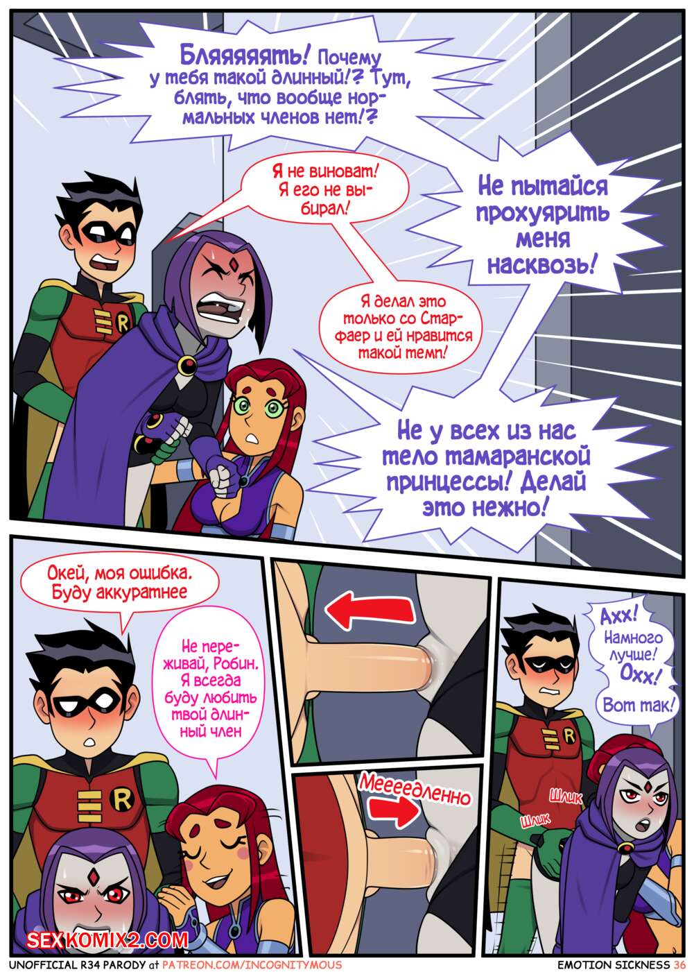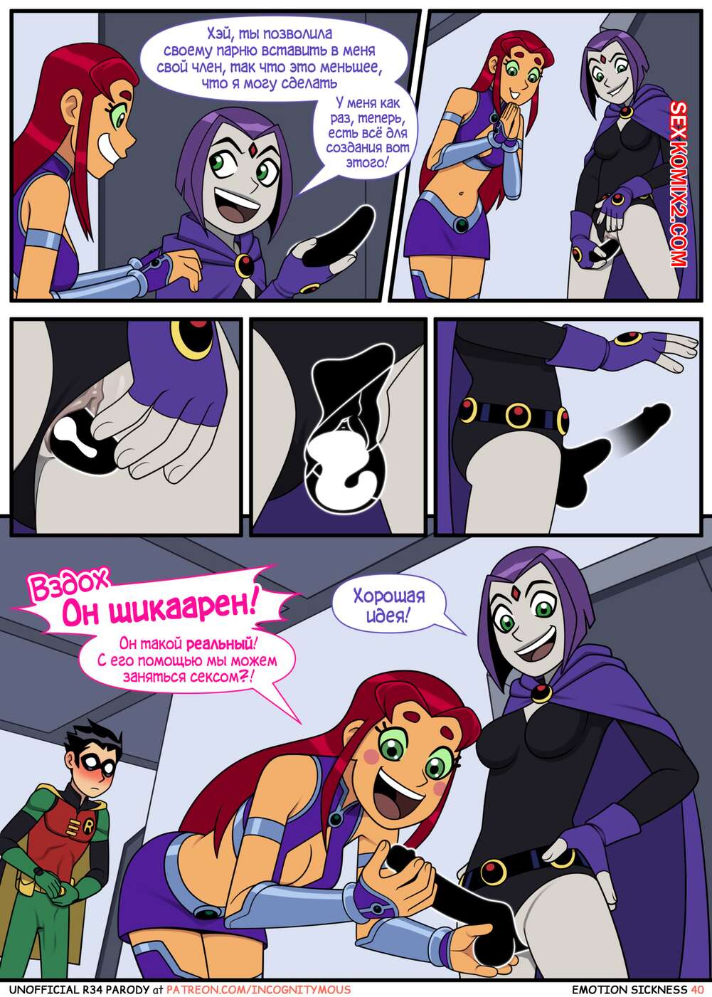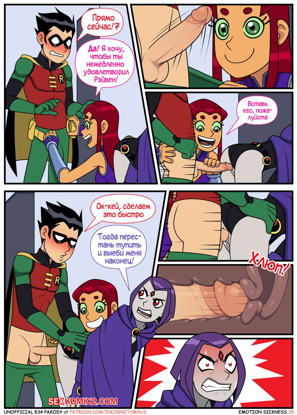 Порно комикс Титаны. Эмоциональная слабость. Часть 1. Emotion sickness. Teen titans. Incognitymous Молодые горячие красотки из команды Титанов были чертовски возбуждены и решили повеселиться со своим дружком. Они разделись перед ним и стали сосать его большой хуй, после чего дали ему себя выебать.