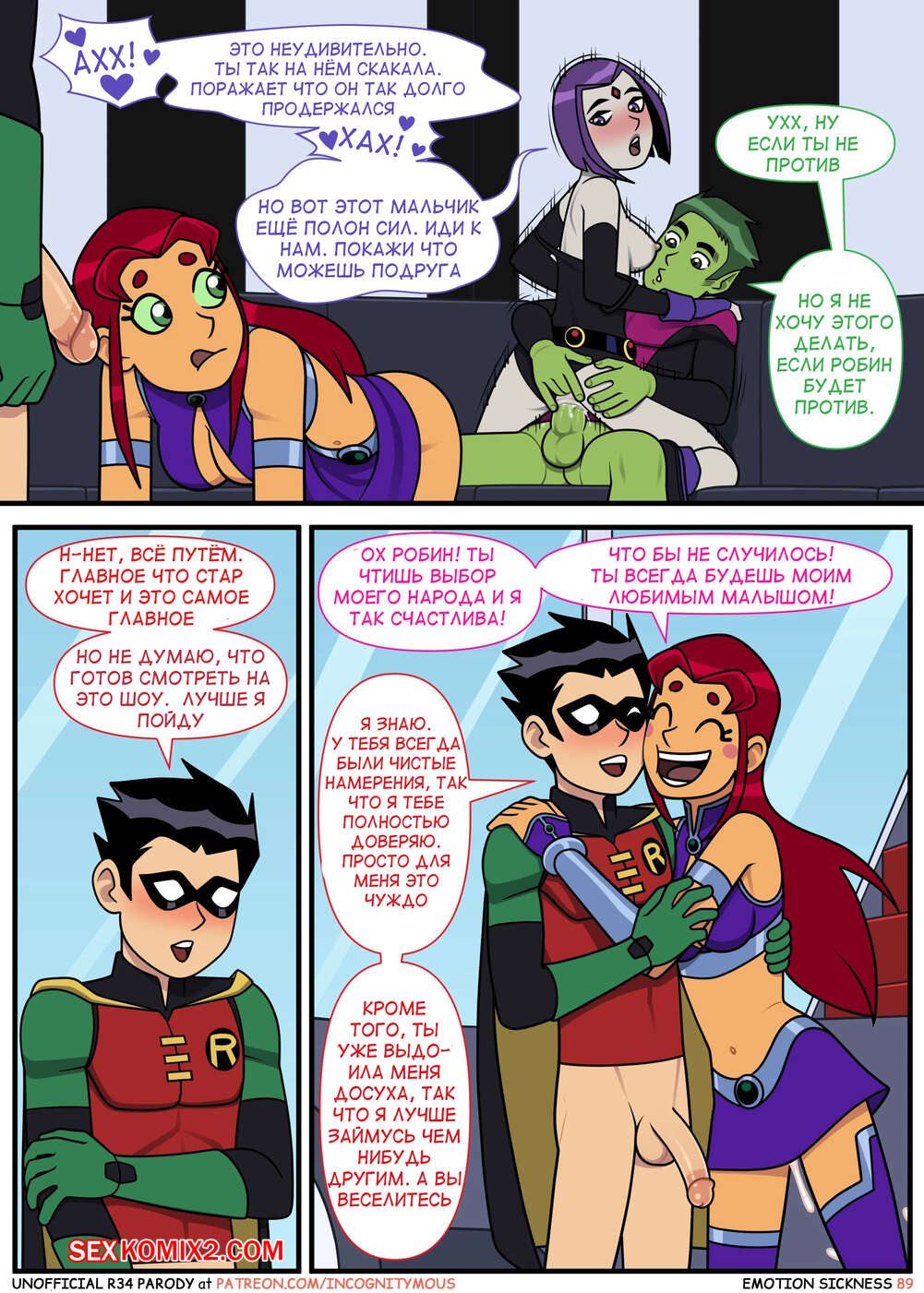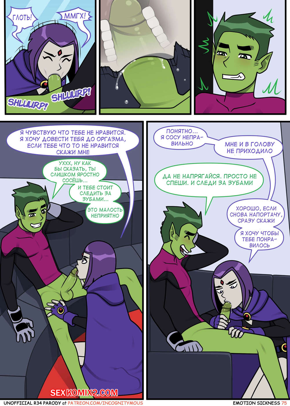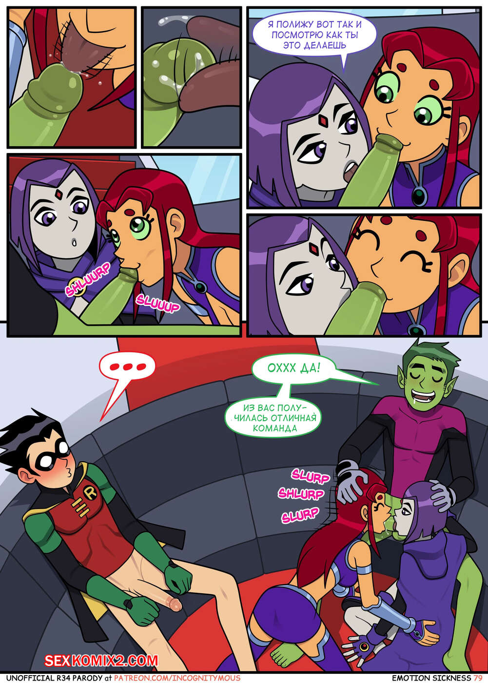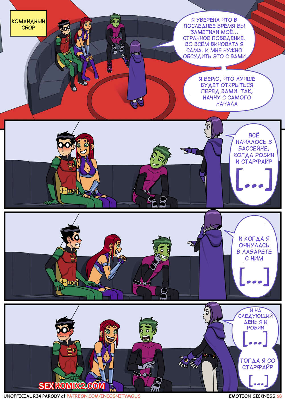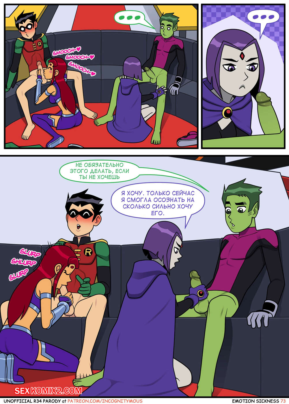 Порно комикс Титаны. Эмоциональная слабость. Часть 2. Emotion sickness. Teen titans. Incognitymous Горячие сисястые красотки Титаны продолжают испытывать огромное возбуждение. Они соблазняют своего дружка и отсасывают у него, после чего дают ему себя хорошенько выебать.