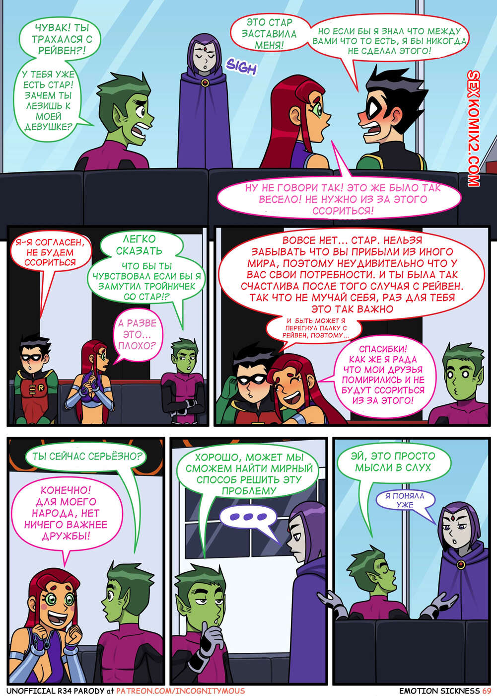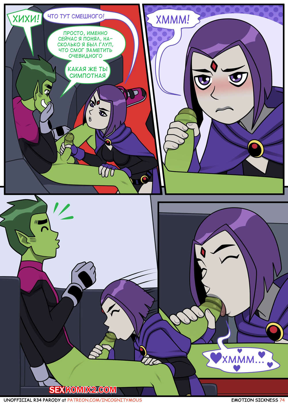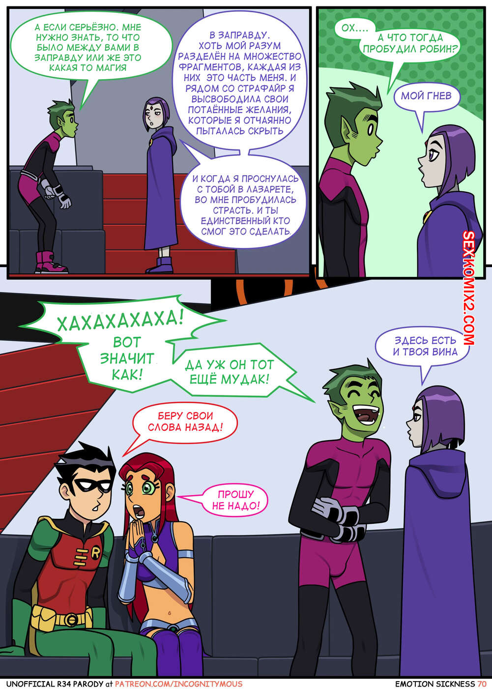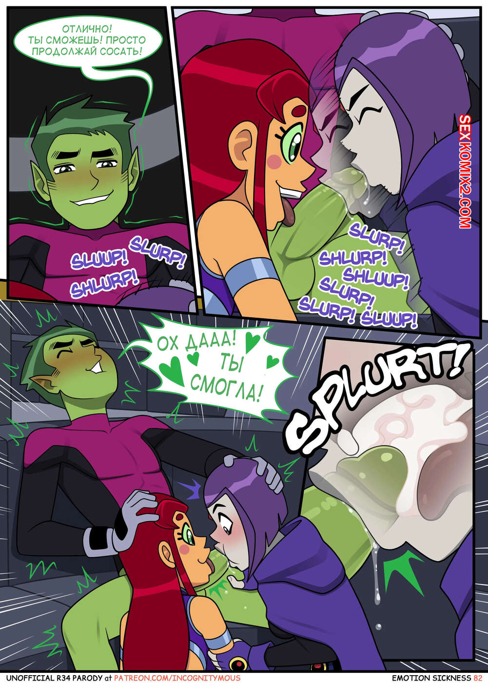 Порно комикс Титаны. Эмоциональная слабость. Часть 2. Emotion sickness. Teen titans. Incognitymous Горячие сисястые красотки Титаны продолжают испытывать огромное возбуждение. Они соблазняют своего дружка и отсасывают у него, после чего дают ему себя хорошенько выебать.