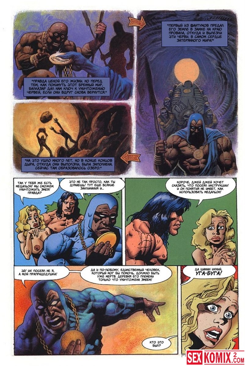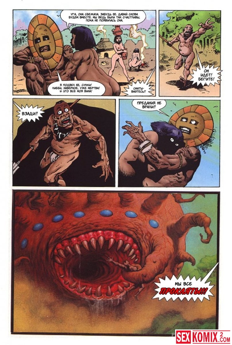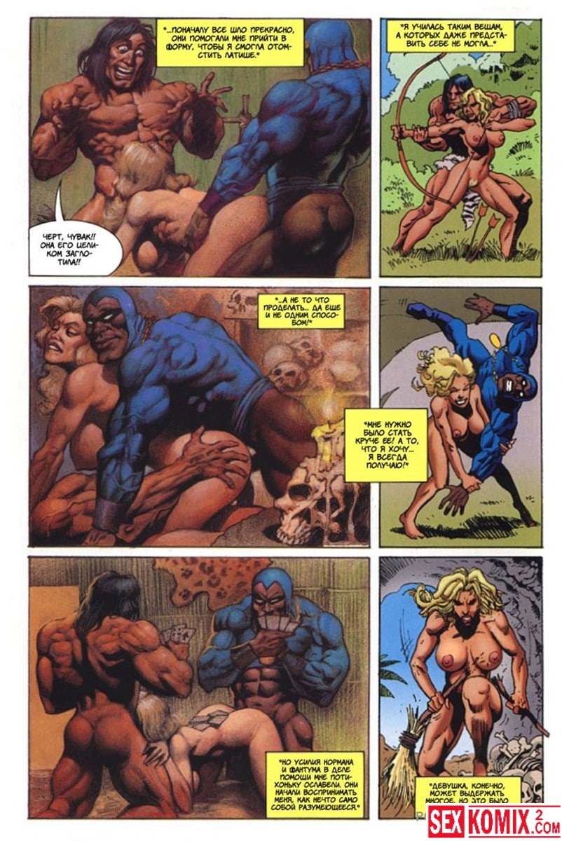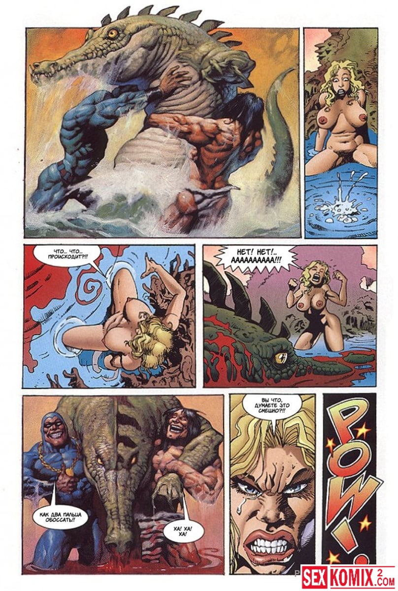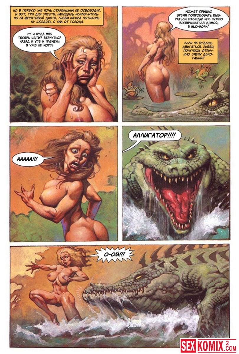 Эротический комикс Латиша и затерянный мир. Часть 3. Блондинка с шикарным телом продолжает выживать на фантастическом острове. Когда моется в озере, на неё пытается напасть гигантский крокодил. Но его прогоняют двое накачанных мужчин. Теперь красотка у них в долгу.