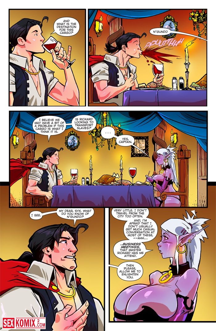 Порно комикс Мир Маны. Часть 5. Кончить на борту. Английский. Глубокожая красотка с большими сиськами гуляла по пристани и ей повстречался капитан корабля, который стоял в гавани. Он пригласил эльфийку на корабль, чтобы угостить ужином. Пока они ели мужчина рассказывал о своих подвигах и гостья потекла.