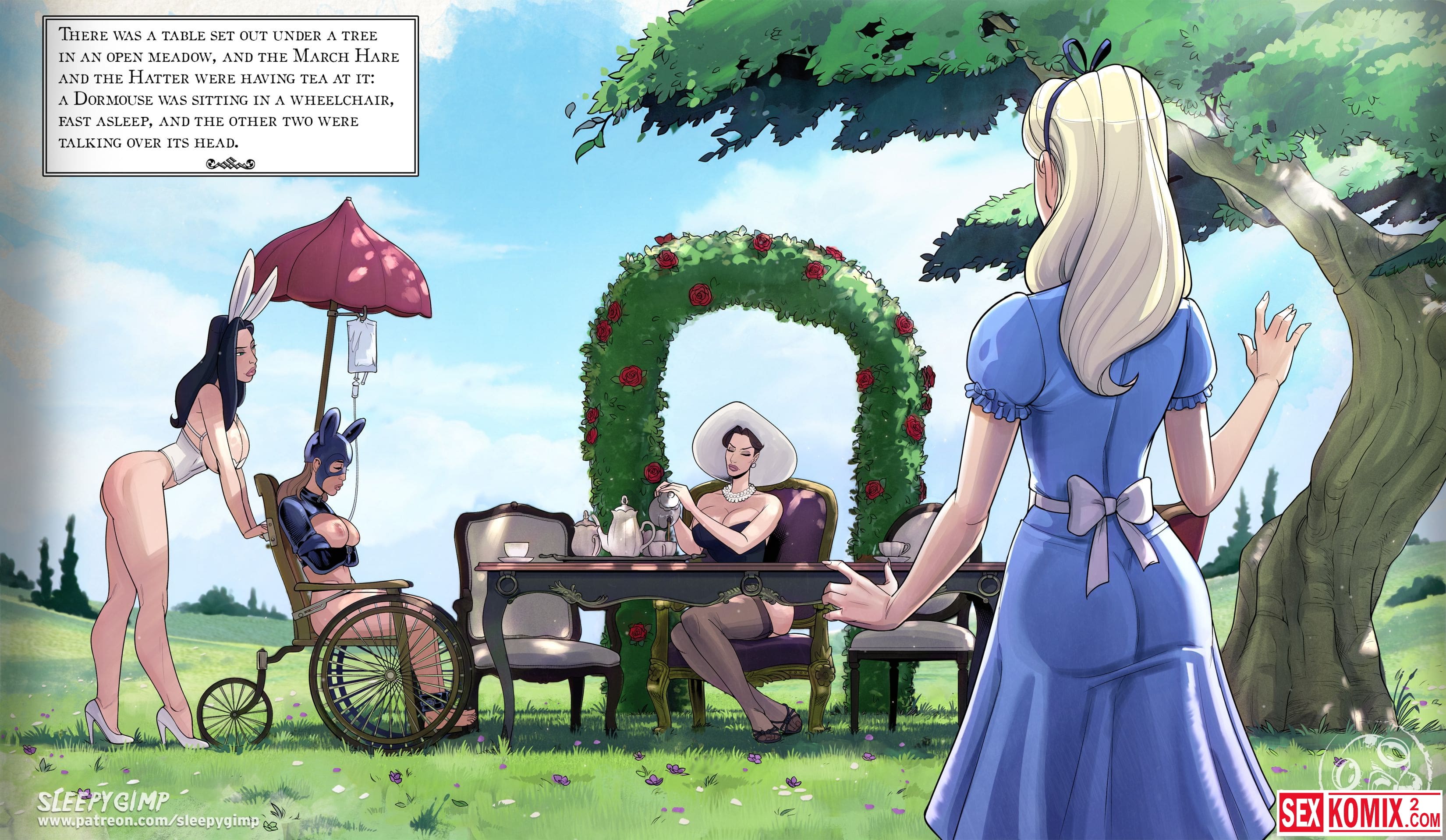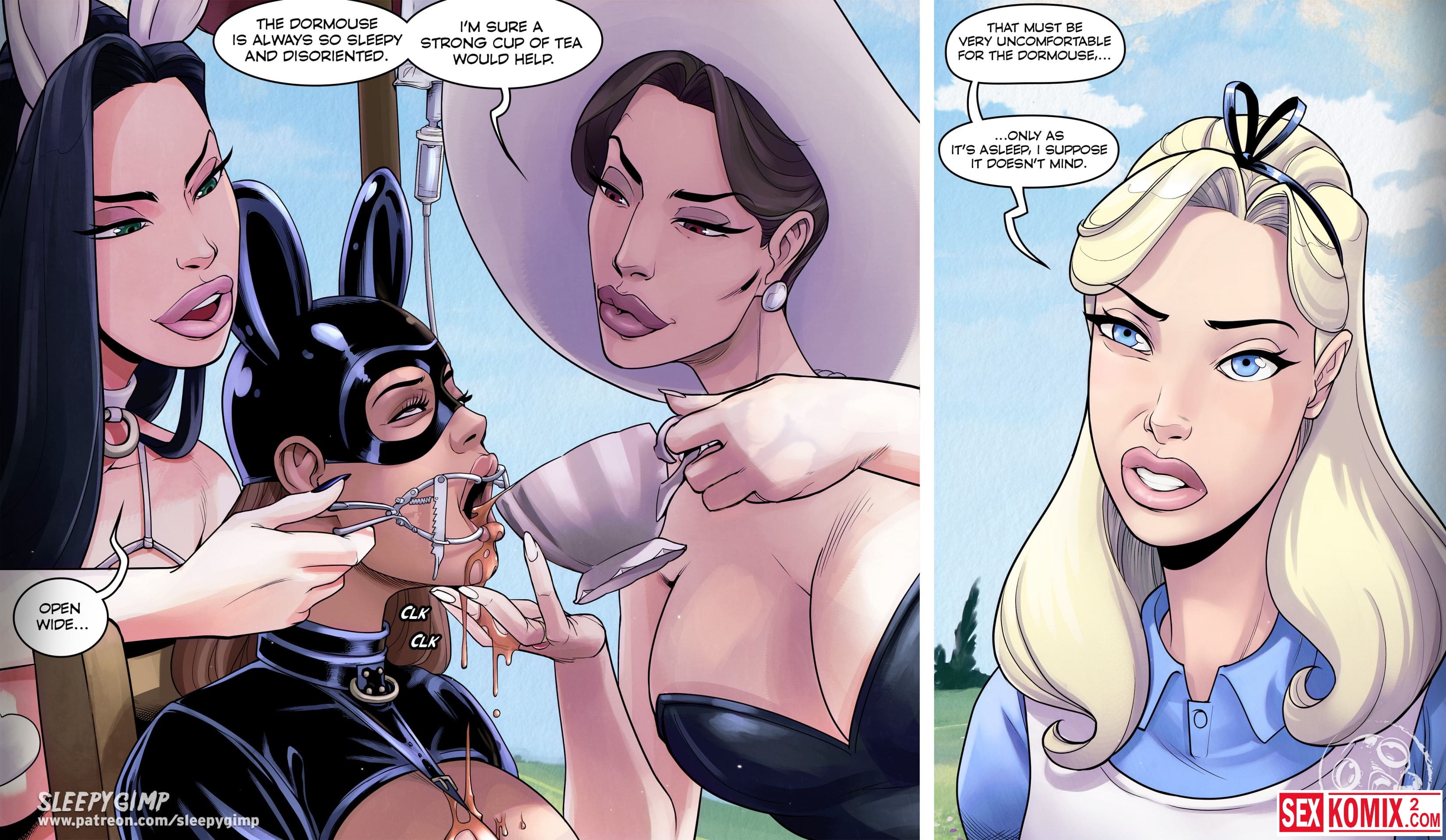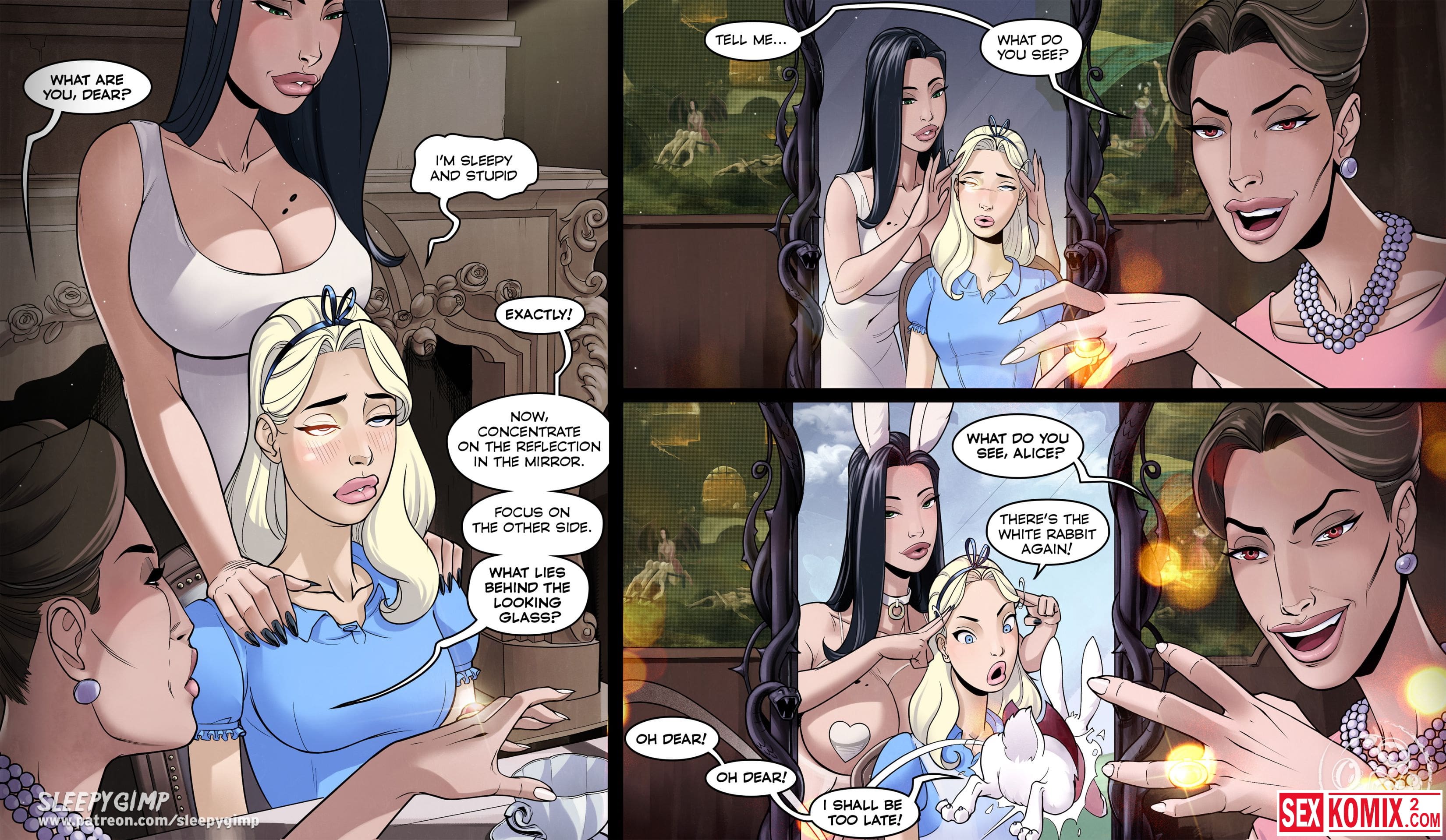 Порно комикс Sleepy Gimp. Зазеркалье. Английский. Аппетитная блондинка получает приглашение в замок на чаепитие, она с радостью туда приходит. Но когда выпивает чай, с ней что-то происходит и она попадает в волшебную страну как Алиса. Но приключения девушки в основном связаны с лесбиянками и БДСМ сексом.