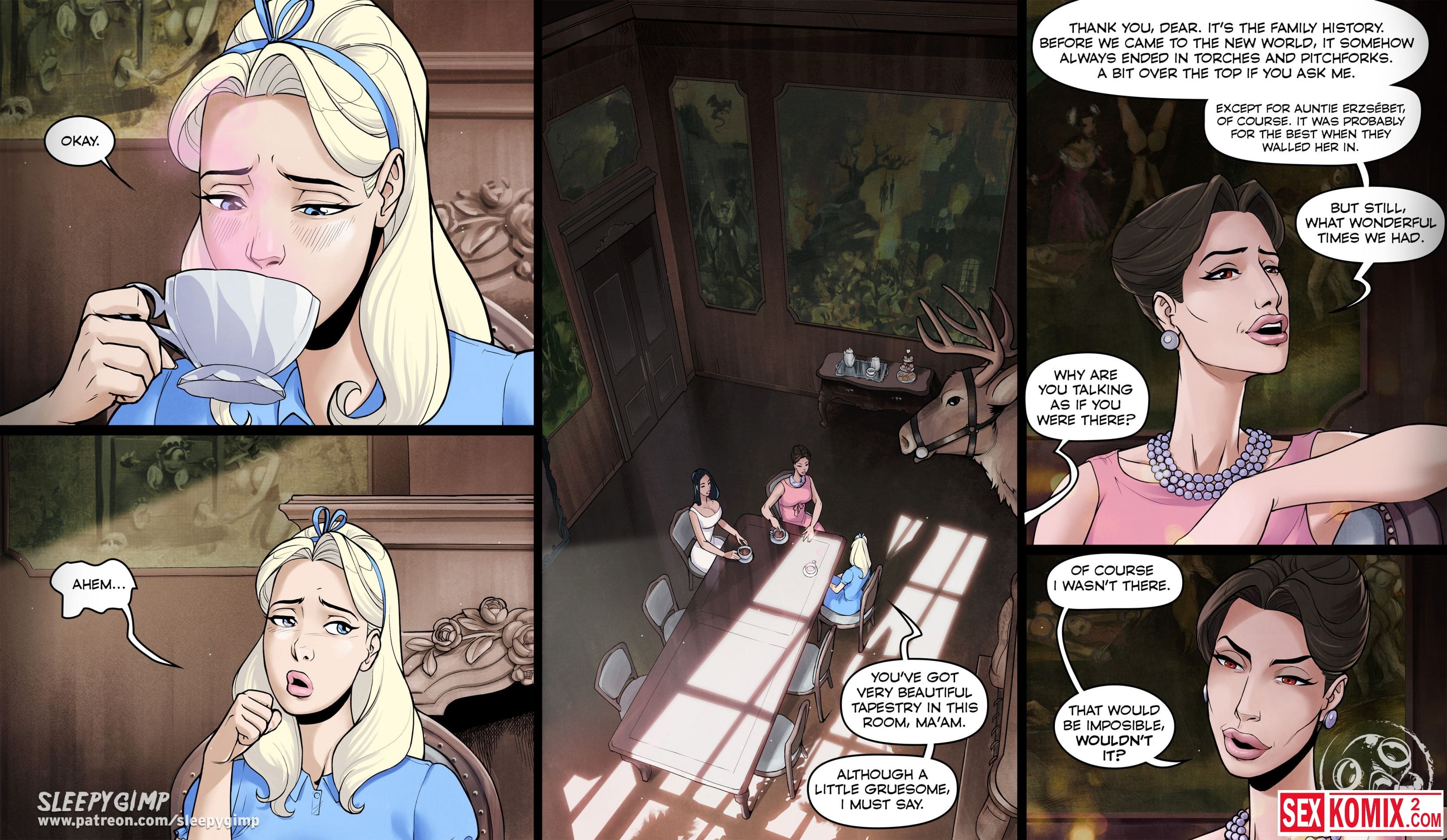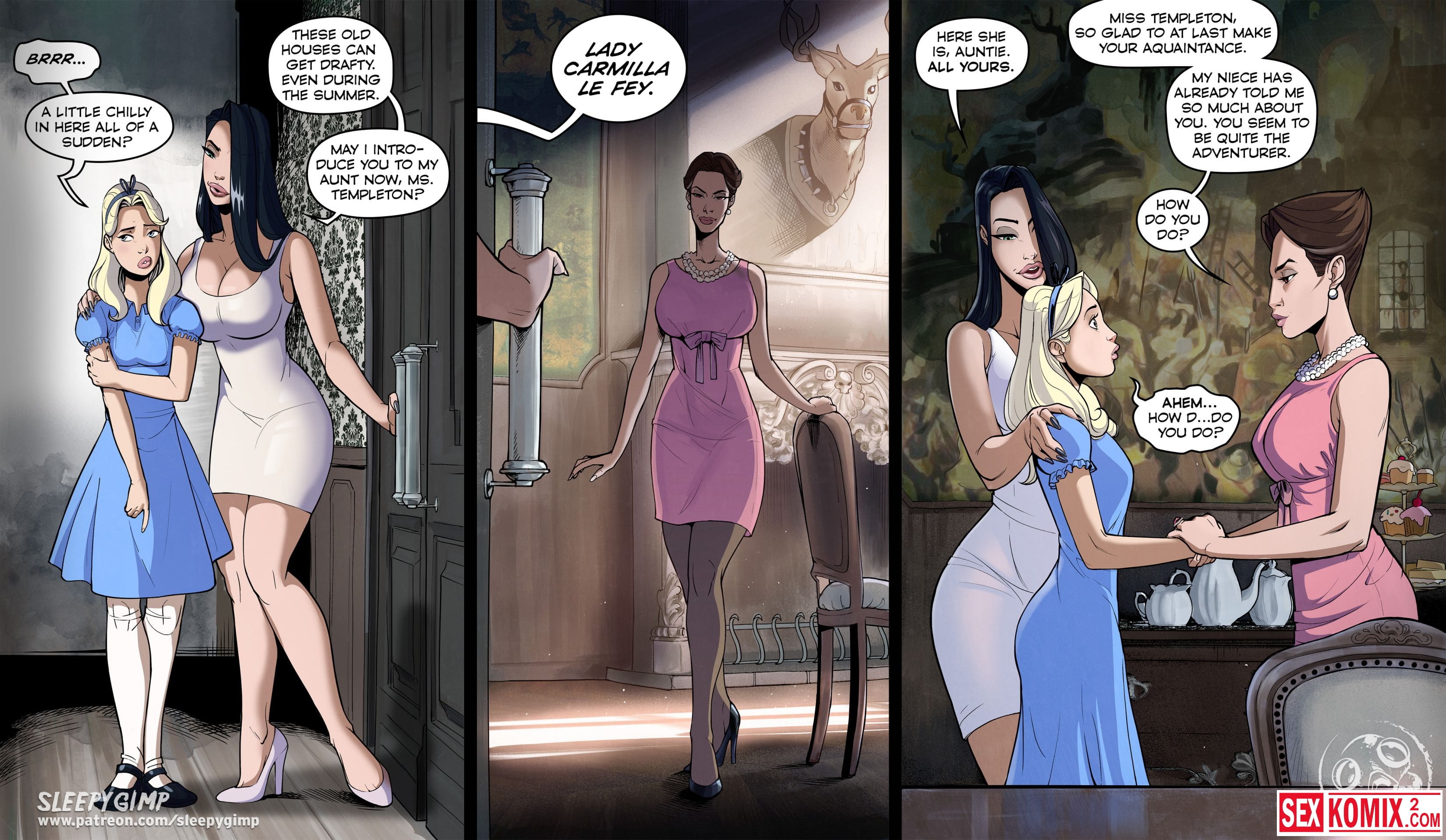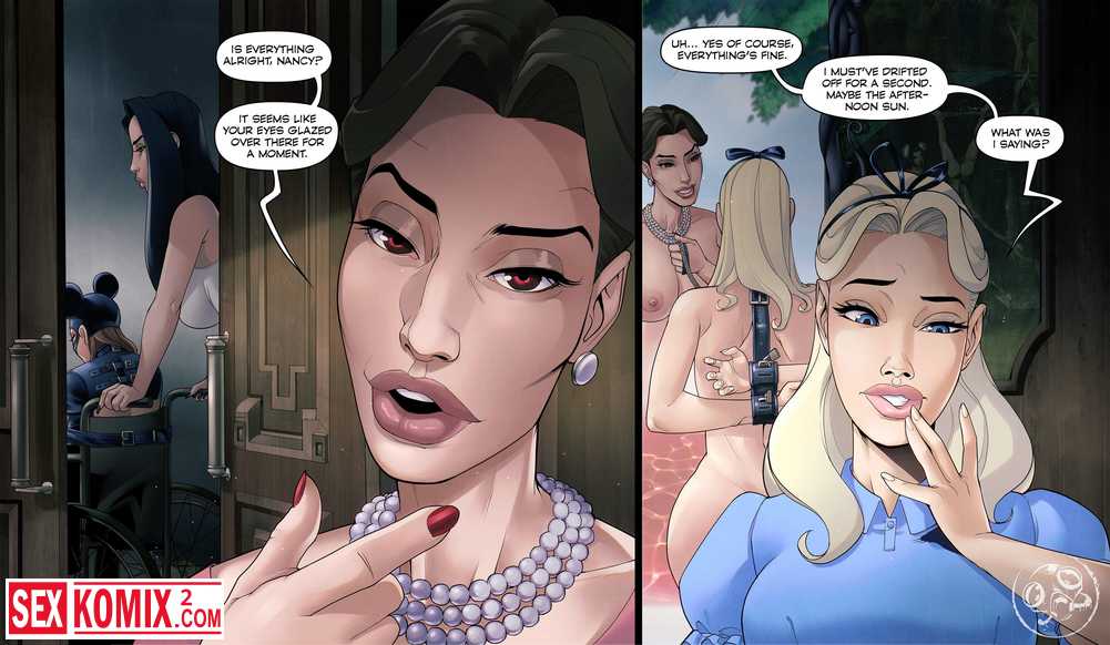Порно комикс Sleepy Gimp. Зазеркалье. Английский. Аппетитная блондинка получает приглашение в замок на чаепитие, она с радостью туда приходит. Но когда выпивает чай, с ней что-то происходит и она попадает в волшебную страну как Алиса. Но приключения девушки в основном связаны с лесбиянками и БДСМ сексом.