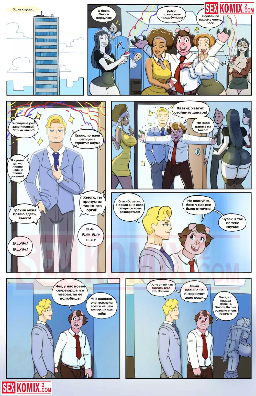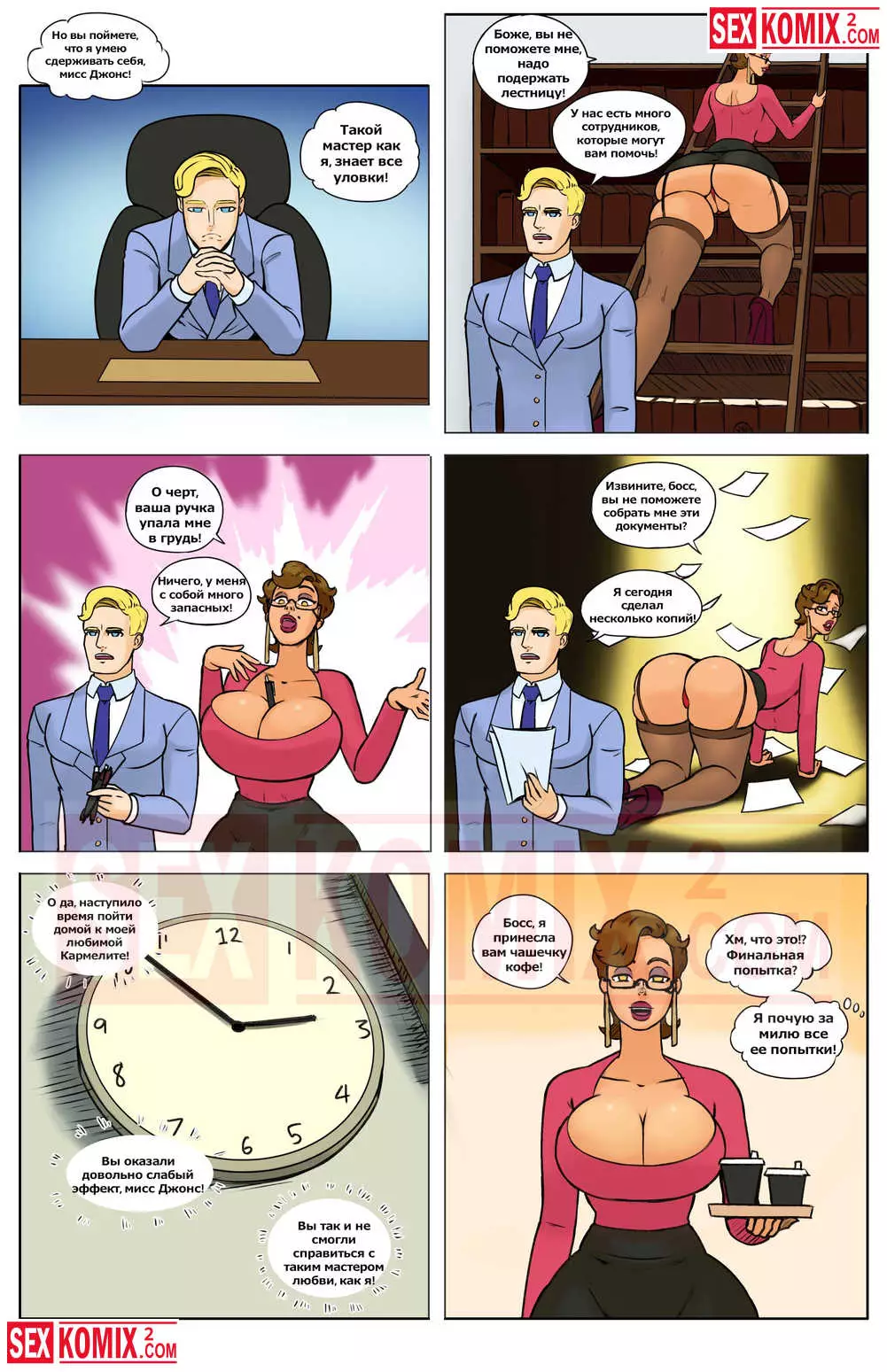 Порно комикс Секретарь Джонс. Развратный босс вышел на работу после долгого отпуска, он плавал на круизном лайнере и трахал там горячую блондинку. Мужчина с радостью рассказывал об этом своим работникам. А чтобы доказать, что он действительно такой крутой как рассказывает, босс трахнул свою секретаршу.