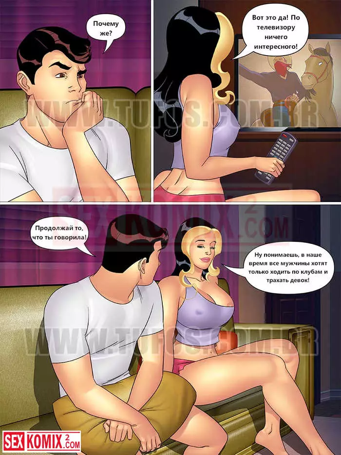 Порно комикс Тетя, кузины и племянник. Часть 6. Смотрим телевизор. Парень хотел спокойно посмотреть кино про ковбоев, но в нему присоединилась симпатичная девушка и переключила на порно фильм. Она так возбудилась, что захотела трахнуть его.