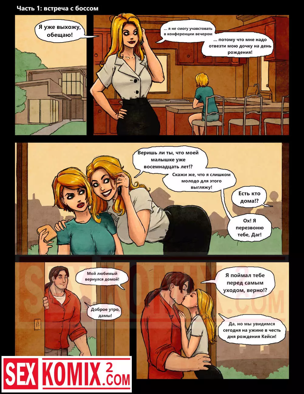 Порно комикс на кухне. У одинокой женщины появился новый парень. Однажды она пошла на работу и он остался дома с её подругой. Между ними пробежала искра и они начали трахаться.
