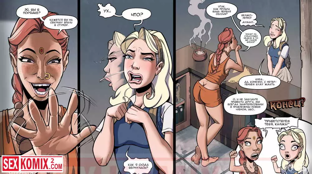 Порно комикс Гипнотизирующая йога. Блондинка пришла в магический магазин за снадобьем и увидела двух женщин близнецов. Они занимались йогой.