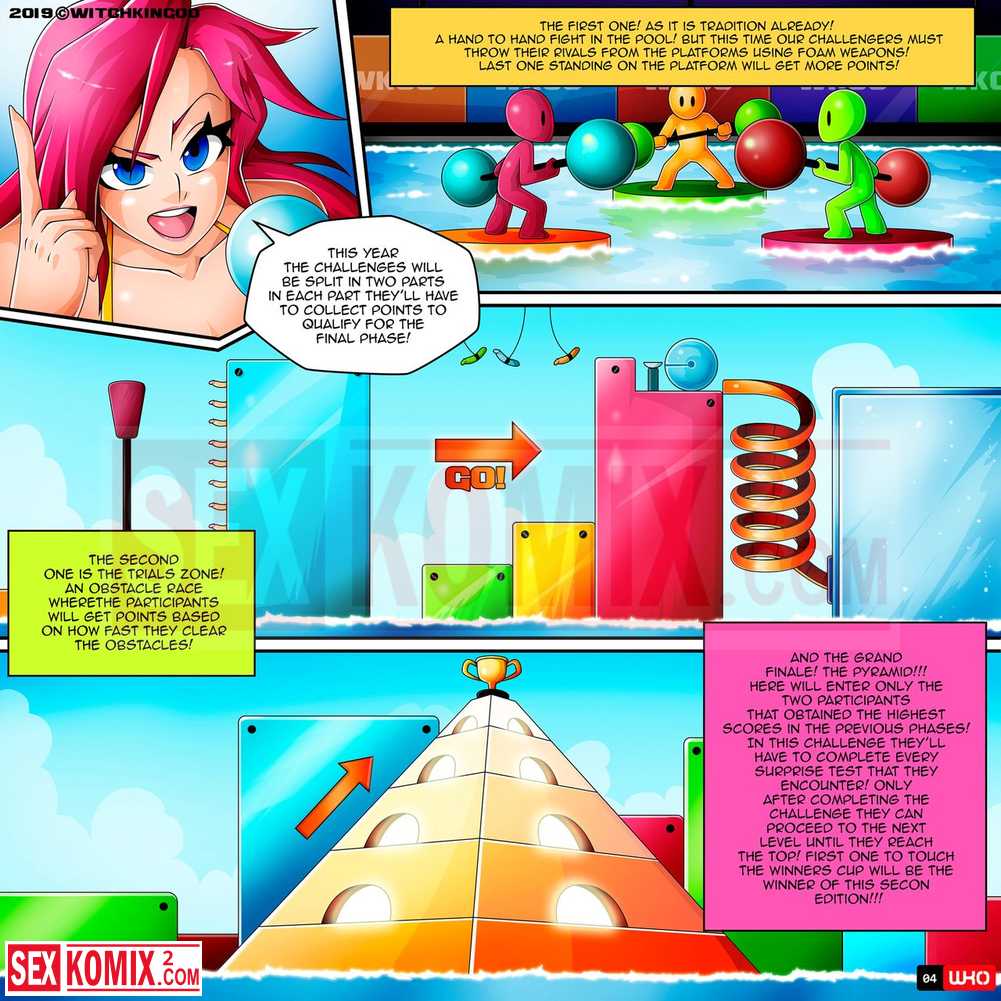 Порно комикс Игры в бассейне. Часть 2. Английский. Развратные красотки с большими сиськами продолжают бороться в воде, они почти все без купальником и видно огромные сиськи.
