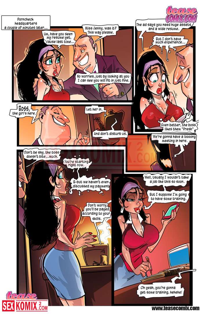 Порно комикс Дженни нужна работа. Знойна брюнетка с большими сиськами пришла устраиваться на работу в крупную корпорацию. Начальник сразу проверил её на профпригодность.