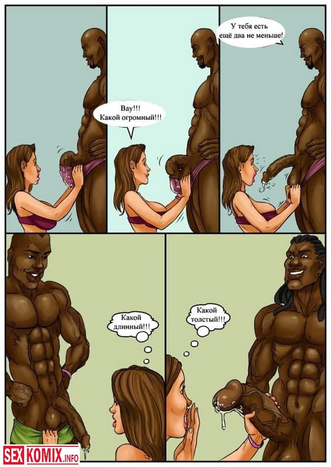Порно комикс Шоколадная комната. Межрасовый комикс о заграничном отдыхе влюбленной пары. Муж сделал жене подарок и заказал ей трех чернокожих парней с огромными членами. Вы увидите как эти парни трахают красотку пока муж смотрит сидя рядом в кресле. Девушка оказалась в восторге от такого подарка.