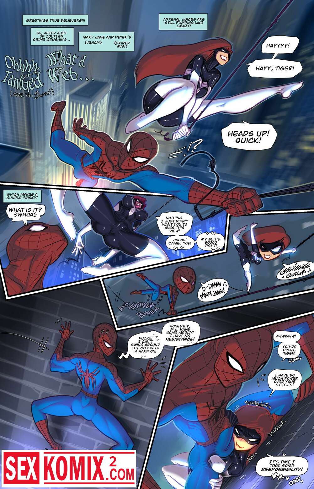 Порно комикс Ох какая запутанная сеть. Человек паук и его знакомая паучиха развлекаются в ночном городе пока преступники спят.