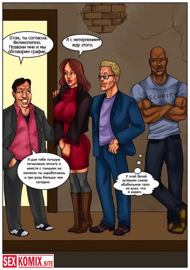 Порно комикс Жене приходиться раздеться. В этом комиксе для взрослых вы узнаете как сексуальной и стройной девушке пришлось отрабатывать долги своего парня занимаясь стриптизом. Эта работа привела её в мир разврата и секса, где красотка познакомилась с чернокожим вышибалой и бросила своего мужа идиота ради большого члена и накаченного тела черного парня.