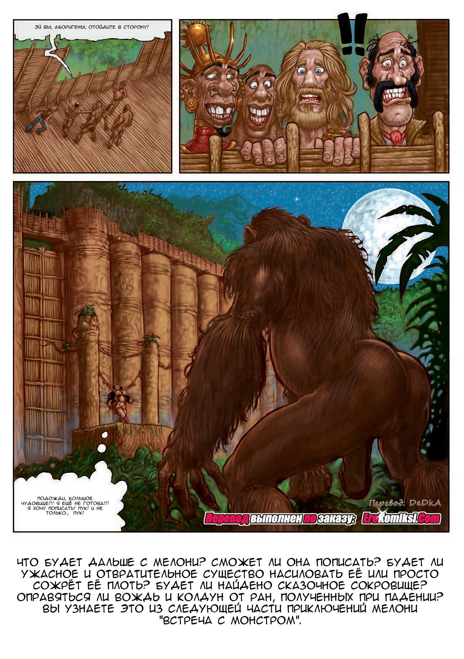 Читайте Порно комикс «Таинственный остров. Часть 2». Читайте продолжение приключений сексуальной Мелони. Команда исследователей вместе с девушкой нашли на необитаемом острове местных жителей, которые хотели съесть их. Но большие сиськи Мелони их передумать…