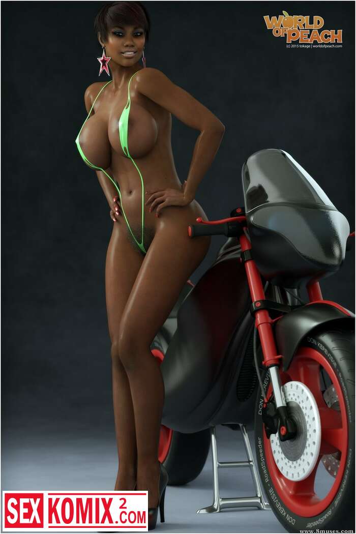 Порно комикс Негритянка и мотоцикл. Горячая фотосессия с пышногрудой чернокожей красоткой у крутого байка.