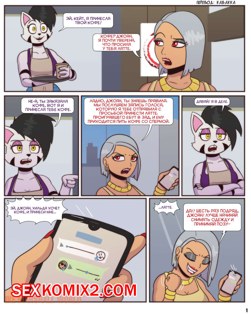 Порно комикс Латте. Latte. Ike Marshall Горячая блондинка с большим членом была очень возбуждена и предложила своей подруге потрахаться. Брюнетка фурри разделась и отсосала большой хуй подруги, после чего дала ей выебать свою задницу.