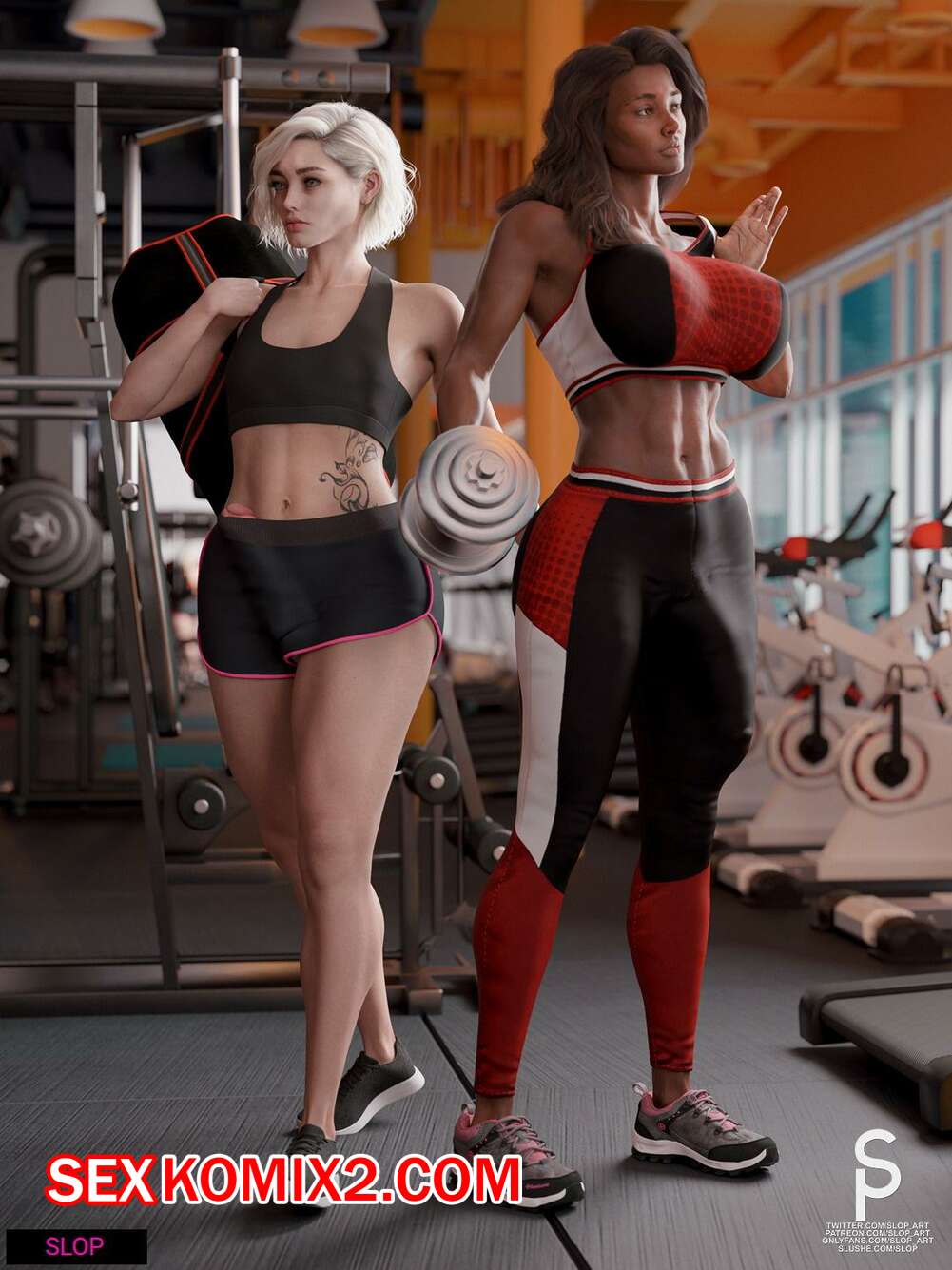 Порно комикс Разработаны. Часть 1. SloP Две подруги с большими членами отправились в спортзал на тренировку, после чего решили повеселиться. Блондиночка отсосала большой хуй подруги, после чего дала ей себя выебать в задницу.