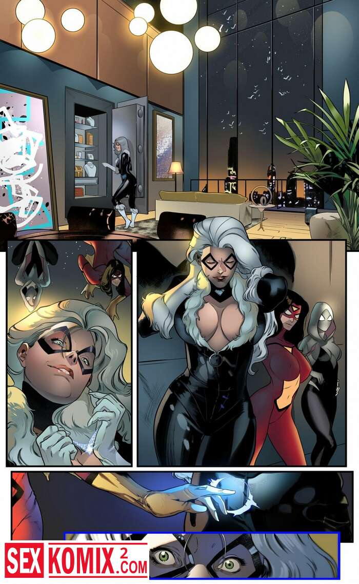 Порно комикс Кошка и пауки. Человек паук. Женщина кошка снова грабит богачей, но двое пауков трансвеститов поймали её. Перед тем как сдать воровку полиции они решили развлечься с ней.