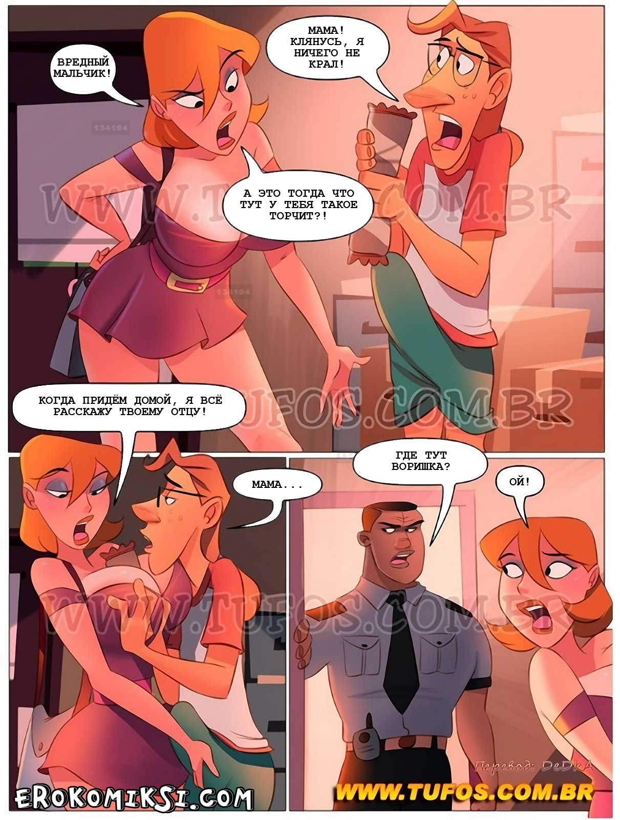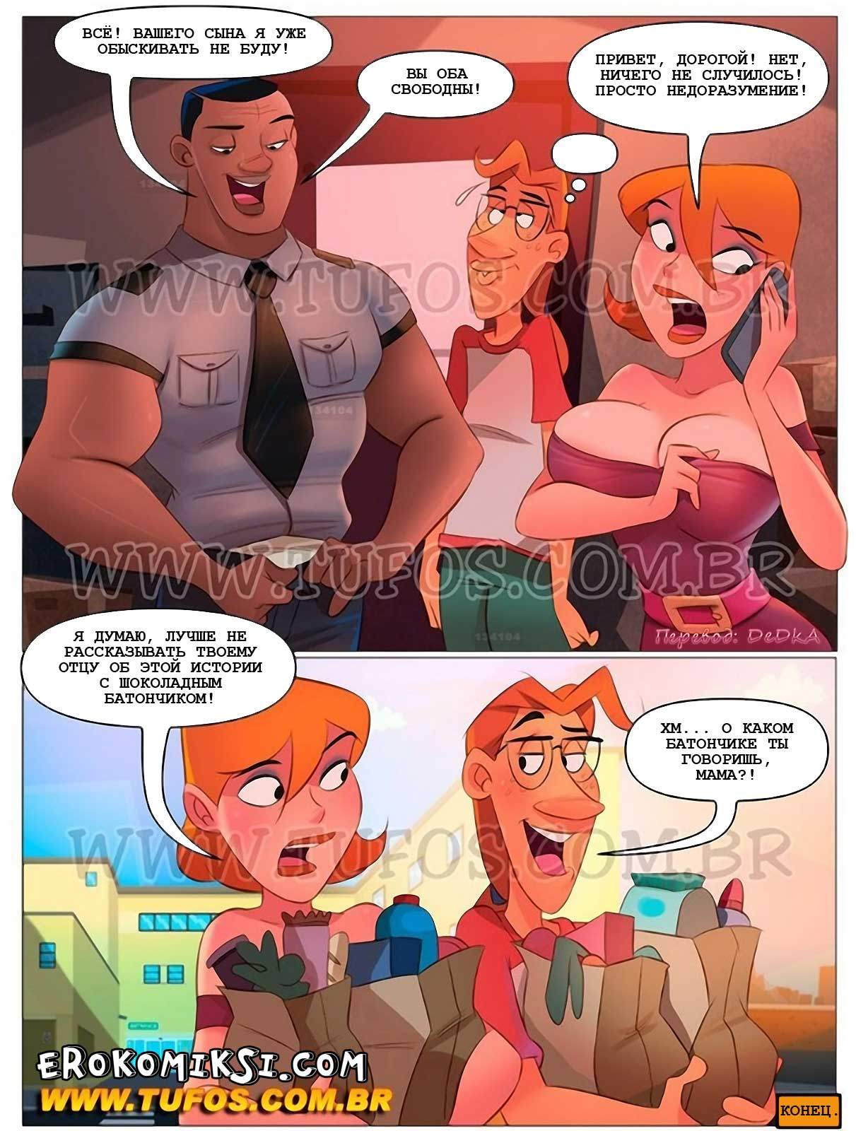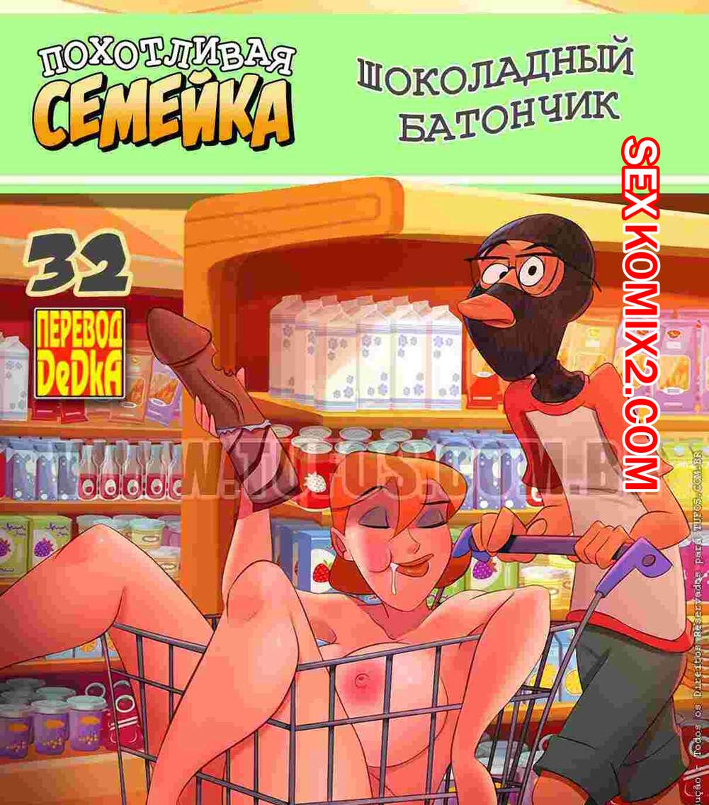 Смотреть порно комиксы «Похотливая семейка. Часть 32. Шоколадный батончик (Familia Sacana)». В этом сэкс комиксе грудастая мамочка со своим озабоченным парнем пошли в супермаркет за покупками. Пока женщина складывала нужные продукты в корзину, он глазел на проходящих мимо девушек в коротеньких платьях и из-за этого у него встал член в штанах. Охранница увидела его член и подумала, что это шоколадка, и что он её украл. Парня с его мамой завели в подсобное помещение, чтобы провести обыск и раздеться, после этого обыск превратился в похотливую оргию.