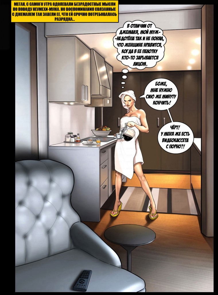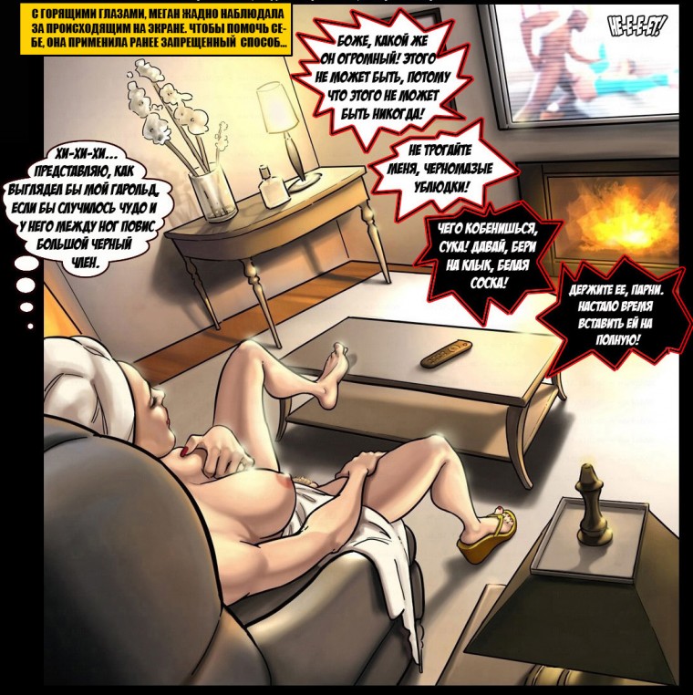 Порно комикс «Уроки от соседа. Часть 3». Это продолжение комикса о развратной белой сучке, она повадилась ходить к своему чернокожему соседу, поскакать на его большом члене. Но вот уже давненько она к нему не ходила и пизденка начала чесаться, девушка думала, что поможет мастурбация, но это совсем не то. Изменять своему мужу снова она не хотела, и отчаянно пыталась получить удовольствие от секса с ним, но и этот вариант её не удовлетворил. Уже отчаявшись окончательно белая цыпочка отправилась снова к своему соседу за хорошей порцией жесткого траха. И чернокожий бугай как всегда, не разочаровал бедняжку, хорошенько её продрав!