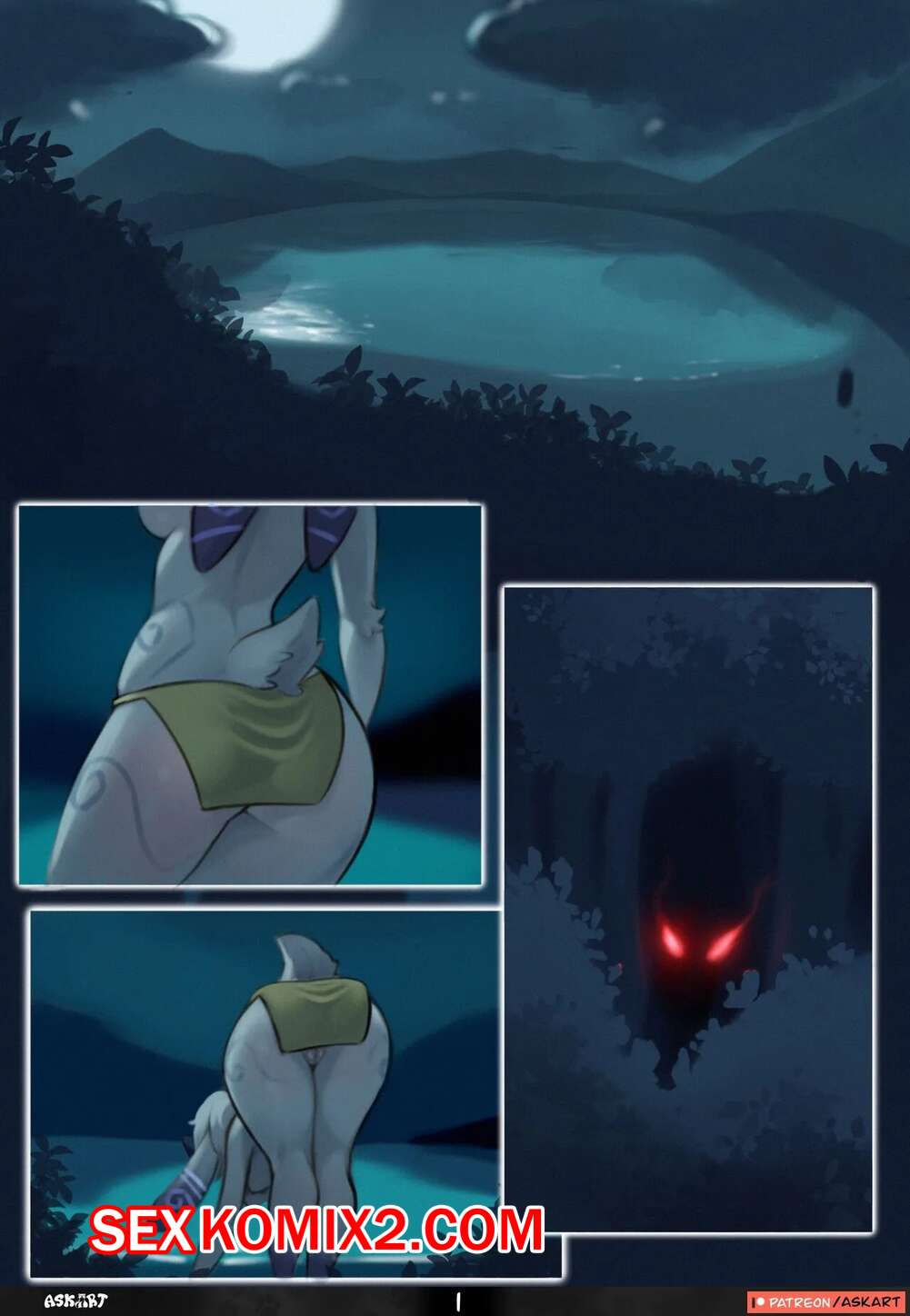 Порно комикс Влажная ночь у озера. A Wet Night by the Lake. ASKART. Горячая блондинка фурри пришла ночью к озеру, откуда к ней вышла девушка с сексуальным телом. Они решили познакомиться поближе и стали ласкать друг дружку.