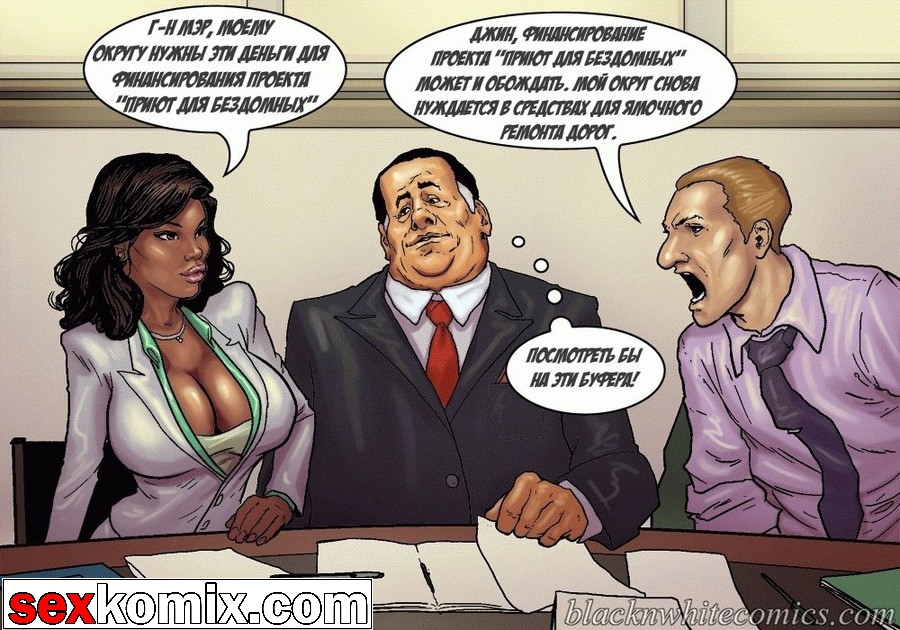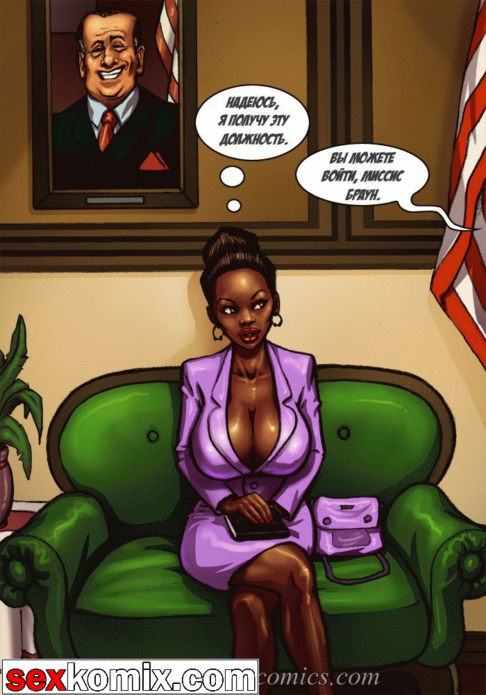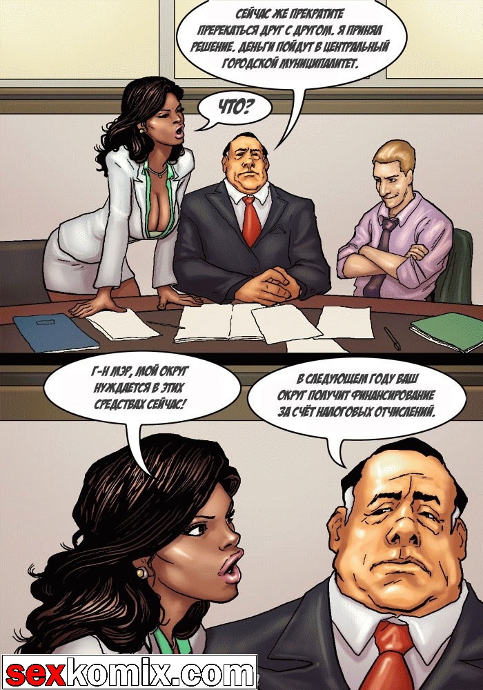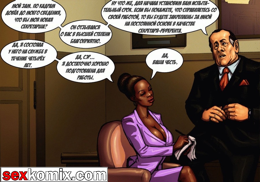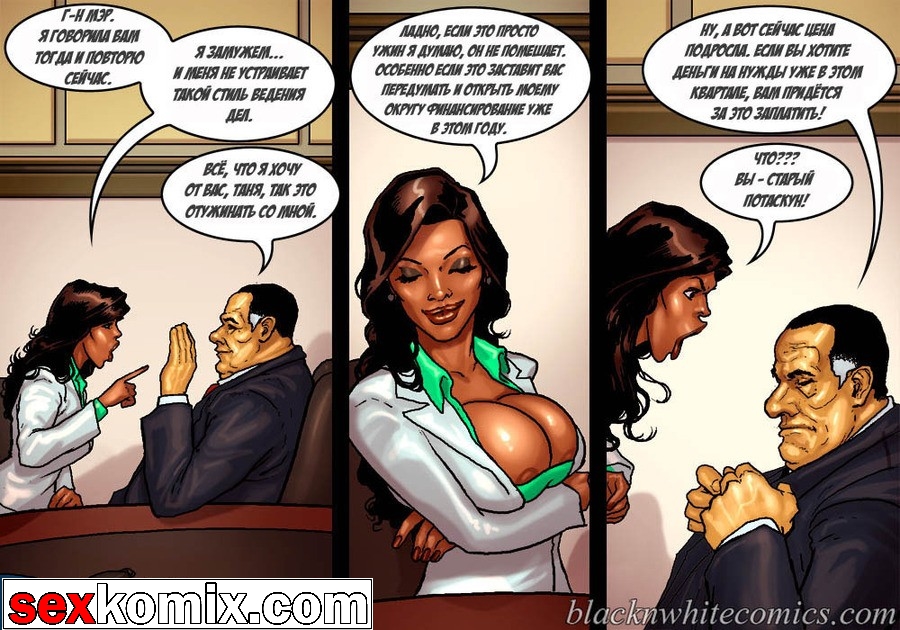 Порно комикс «Мэр (Mayor)». Этот секс комиксы на русском о красивой жизни мэра города, у него есть деньги и власть, все девушки города тоже принадлежат ему. В первой половине комикса мы видим как молодая чернокожая девушка пришла на собеседование, на должность секретарши мэра. Мужчина сразу обратил внимание на большие сиськи и круглую задницу – это плюс! Но самое важное качество, которым должна обладать секретарша, это удовлетворять все прихоти, своего боса. Естественно в основном это сексуальные желания, чтобы узнать как девушка справляется с этой обязанностью, нужно проверить всё на практике. Мэр попросил её раздеться и приступить к работе, он расстегнул ширинку и достал свой огромный член.