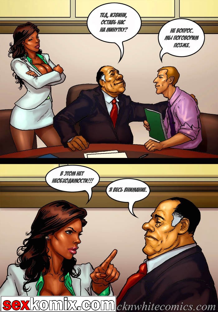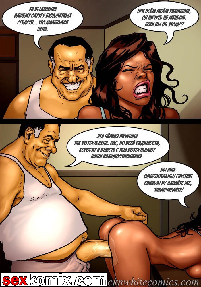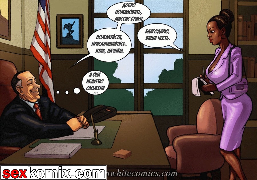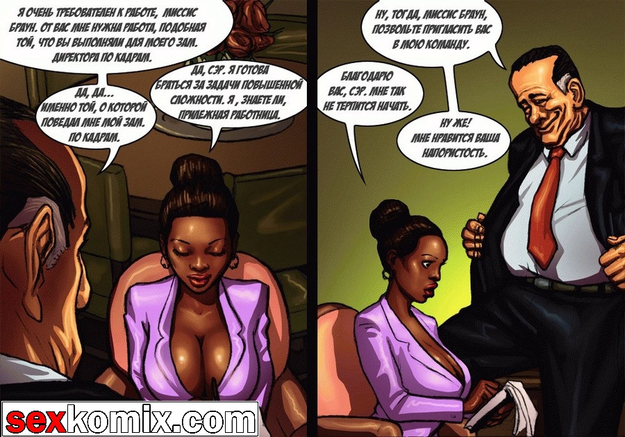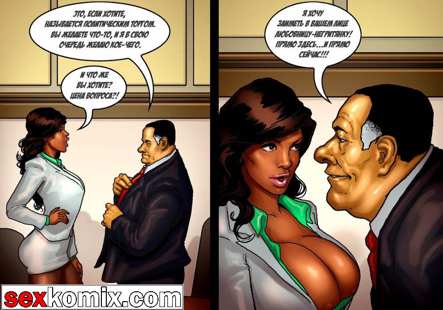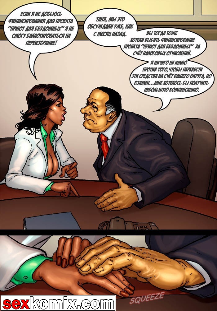 Порно комикс «Мэр (Mayor)». Этот секс комиксы на русском о красивой жизни мэра города, у него есть деньги и власть, все девушки города тоже принадлежат ему. В первой половине комикса мы видим как молодая чернокожая девушка пришла на собеседование, на должность секретарши мэра. Мужчина сразу обратил внимание на большие сиськи и круглую задницу – это плюс! Но самое важное качество, которым должна обладать секретарша, это удовлетворять все прихоти, своего боса. Естественно в основном это сексуальные желания, чтобы узнать как девушка справляется с этой обязанностью, нужно проверить всё на практике. Мэр попросил её раздеться и приступить к работе, он расстегнул ширинку и достал свой огромный член.