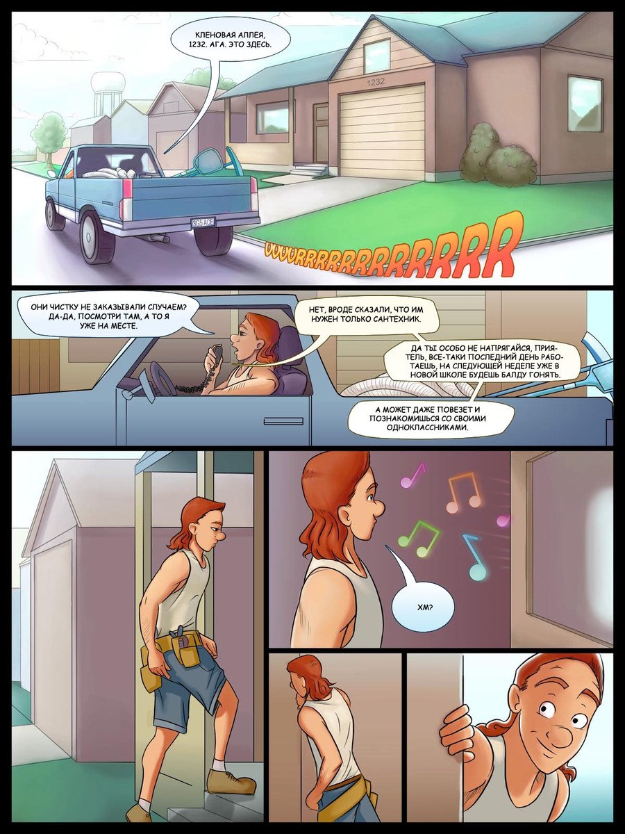 Порно комикс «Сервис с улыбкой». Смотрите комикс о молодом сантехнике, он приехал на вызов по засору бассейна. Когда он зашел во двор дома, увидел двух сексуальных девушек. Они были в одних купальниках, полуголые теля красоток парню очень понравились, но все токи он приступил к своей работе. Прочищая фильтр бассейна , сантехник нашёл лифчик от купальника и выглядело это так, будто его специально туда положили. В этот момент к нему подошла одна из девушек и её шикарная грудь была голой, оказалось это был её купальник. У парня от такого вида встал член и стал твердым как кол. Развратные девушки поняли, что он уже готов и набросились на свою жертву.