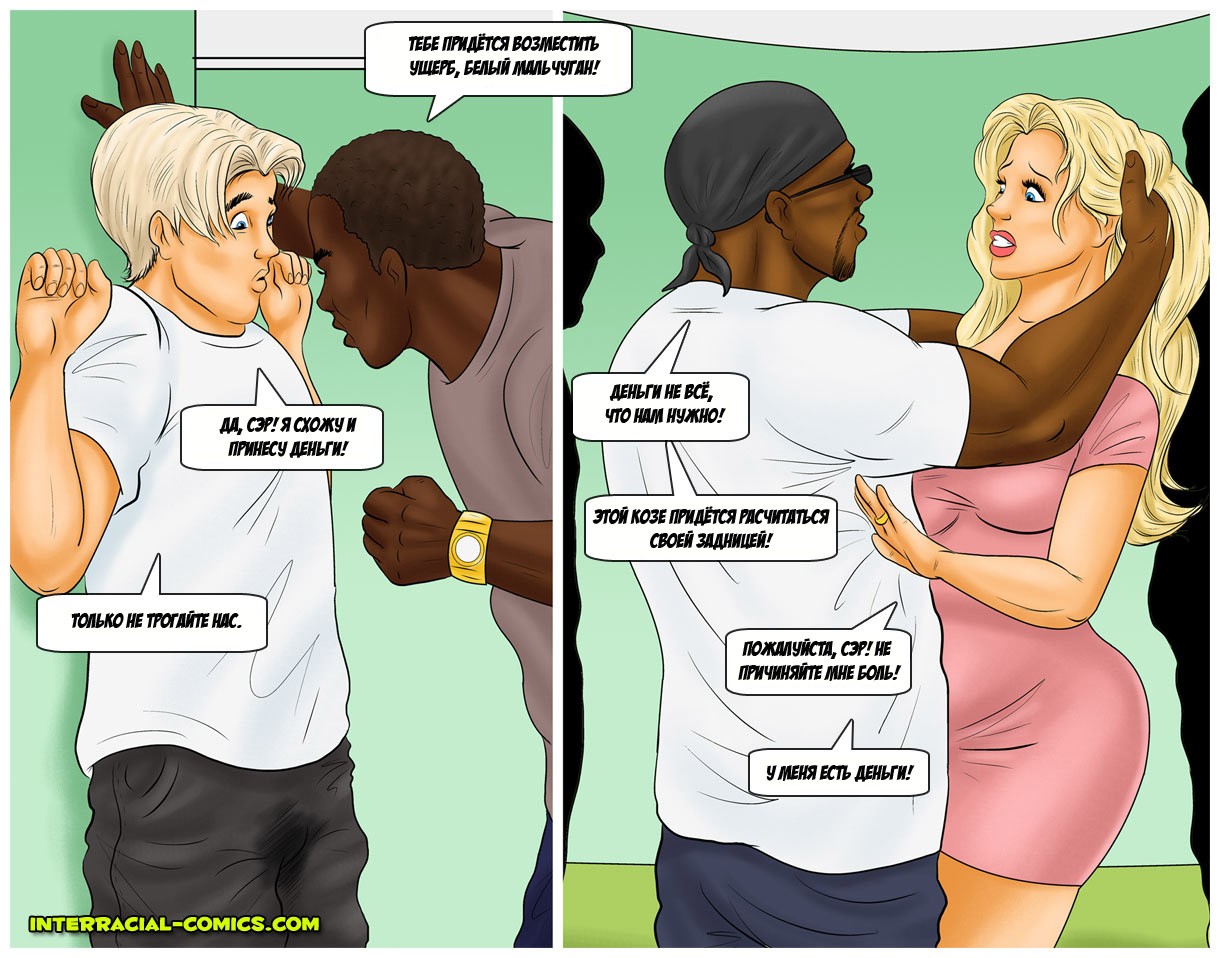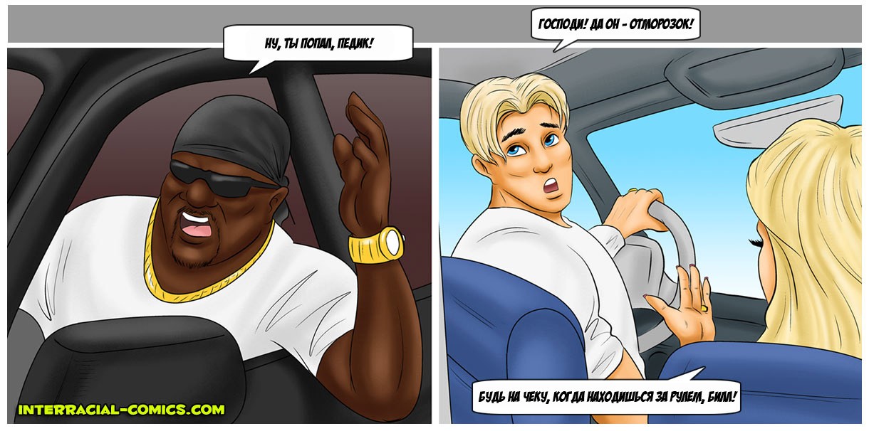 Порно комикс «Возмещение ущерба». Простой парень со своей женой, сексуальной блондинкой ехали по трассе и случайно зацепили соседнюю машину. Это был джип, из него вылезли чернокожие братки и потребовали денег за нанесенный ущерб. Парень зарабатывает не много и у него нет столько денег, но парням приглянулась его горячая жёнушка и они предложили трахнуть её в замен денег. Несчастному не хотелось подставлять свою спутницу, но выбора у него не было, тем более от виды накаченных черных тел девушка уже возбудилась и её трусики были мокрые.