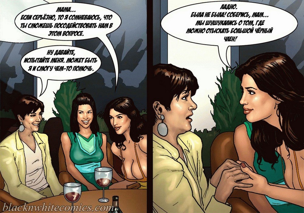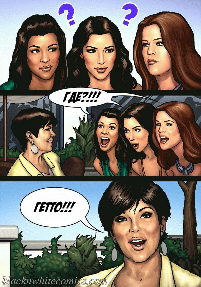 Порно комикс «Так держать семейка Карданшьян. Часть 1: Пари». В начале комикса мы видим как горячая брюнетка хвастается своим развратным сестрам, домашним порно видео, которое она сняла со своим чернокожим парнем. На нём она заглатывает его огромный член глубоко себе в глотку, занимается анальным сексом и проглатывает всю сперму которую парень ей даёт. Сёстры в шоке от увиденного, они не могут поверить, что такой гигант поместился в её стройном теле. Но порно звезда заявляет, что на этом она не остановится, и ей нужен член побольше или даже несколько. Смотрите сексуальные похождения ненасытной сестрички!