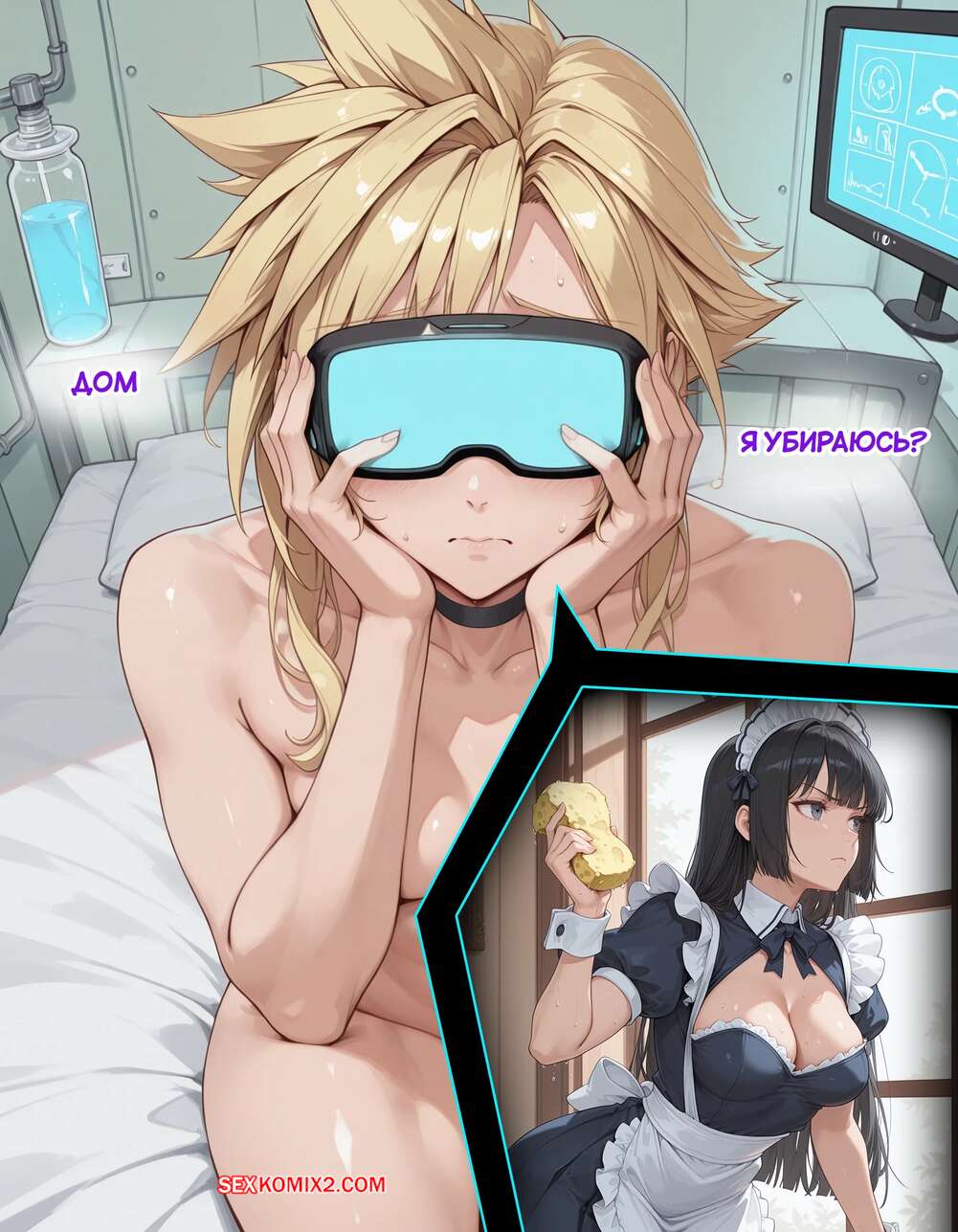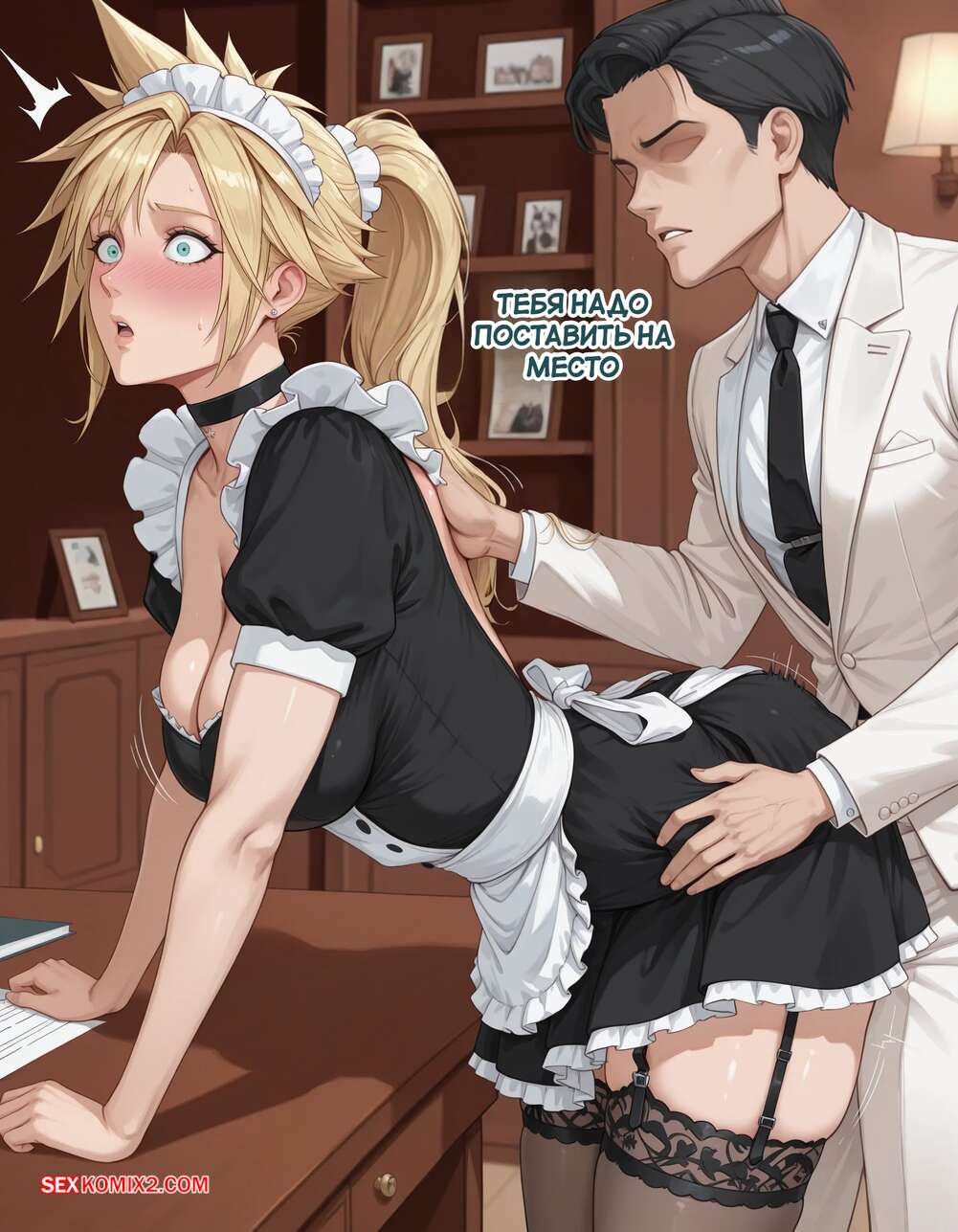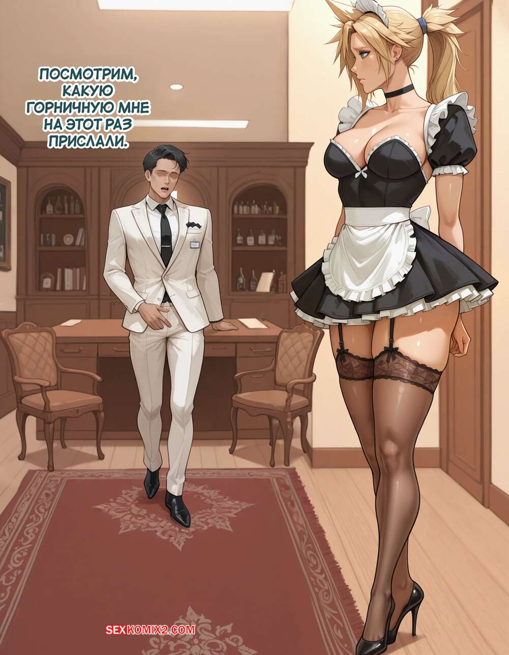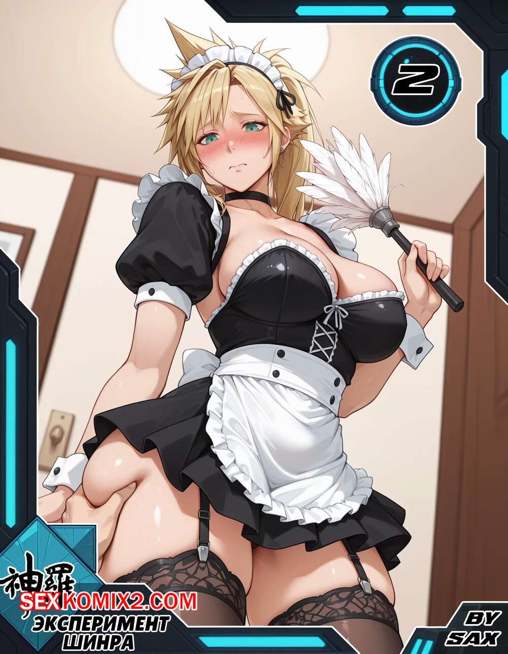 Порно комикс Эксперимент Шинра. Часть 2. The Shinra Experiment. SAX Блондиночка продолжает свыкаться со своей новой жизнью. Красотка надела костюм горничной и отправилась в офис парня, чтобы убраться, но она стал ласкать ее пизденку пальцами, желая хорошенько трахнуть.