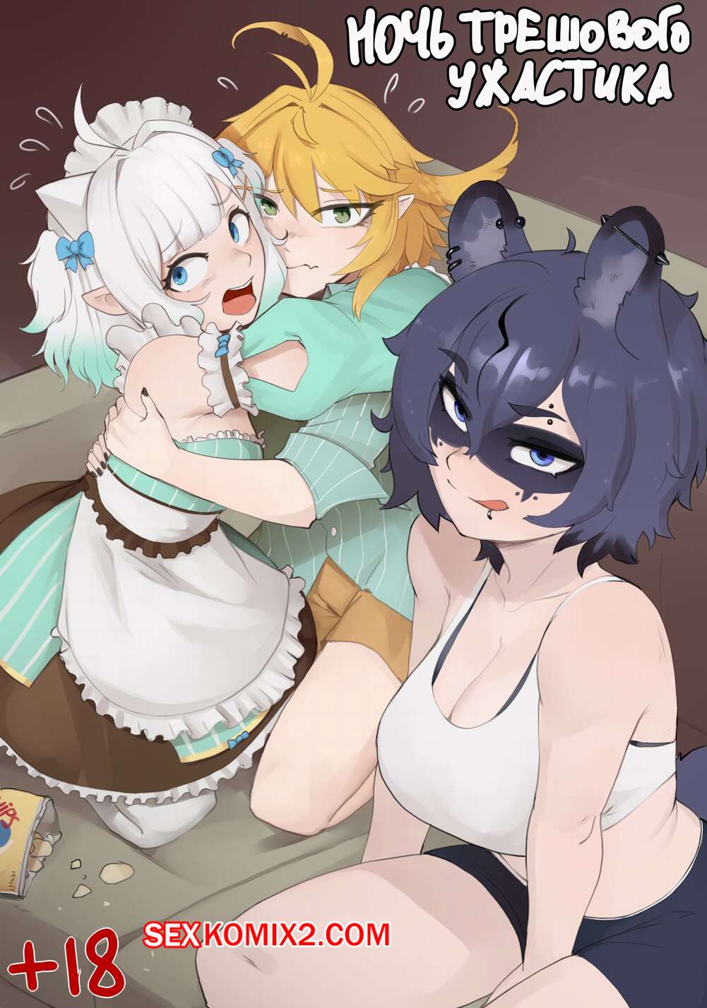 Порно комикс Ночь трешового ужастика. Trash Horror Night. Raccoon В дом к красоткам ворвался монстр и они нашли способ его утихомирить. Сучки разделись и стали ласкать его большой член, после чего раздвинули ножки и дали себя выебать.
