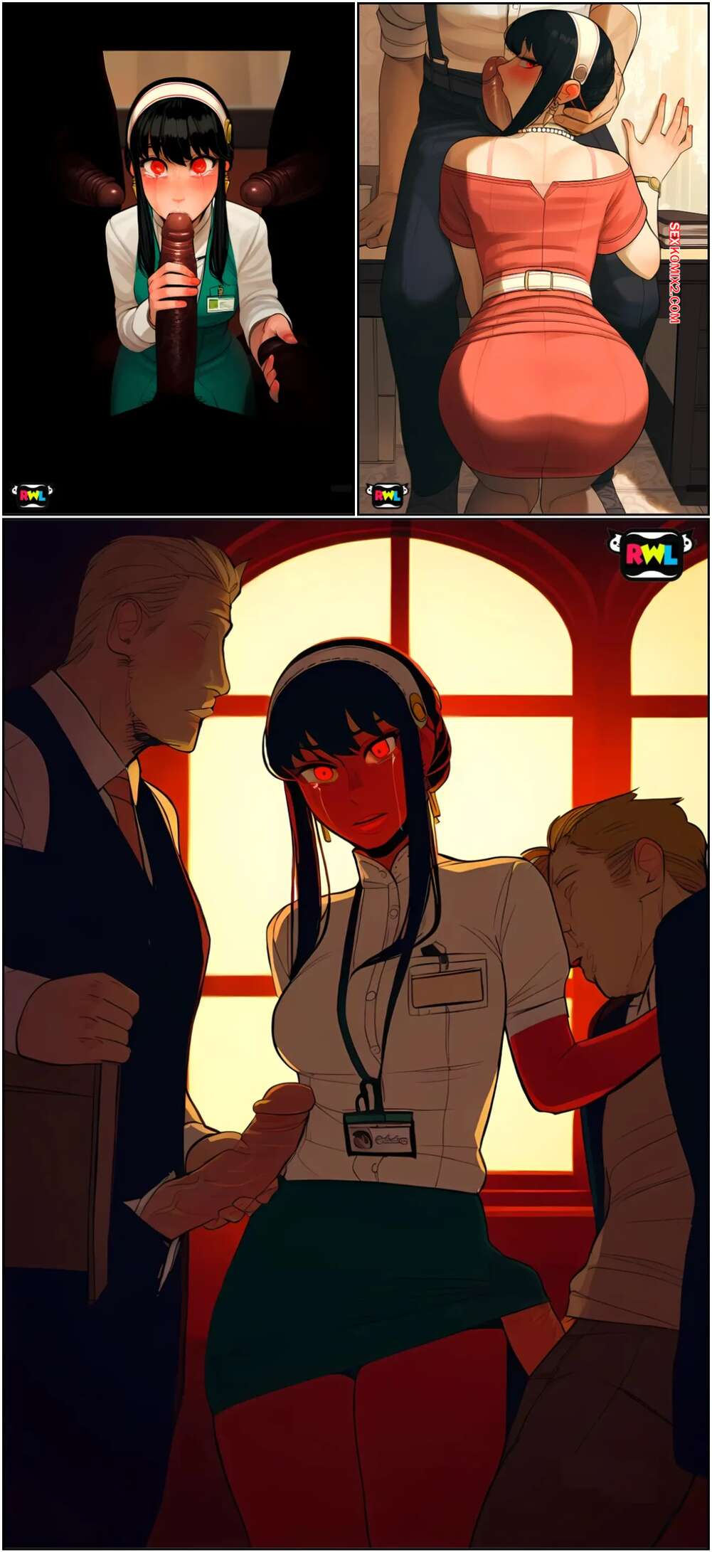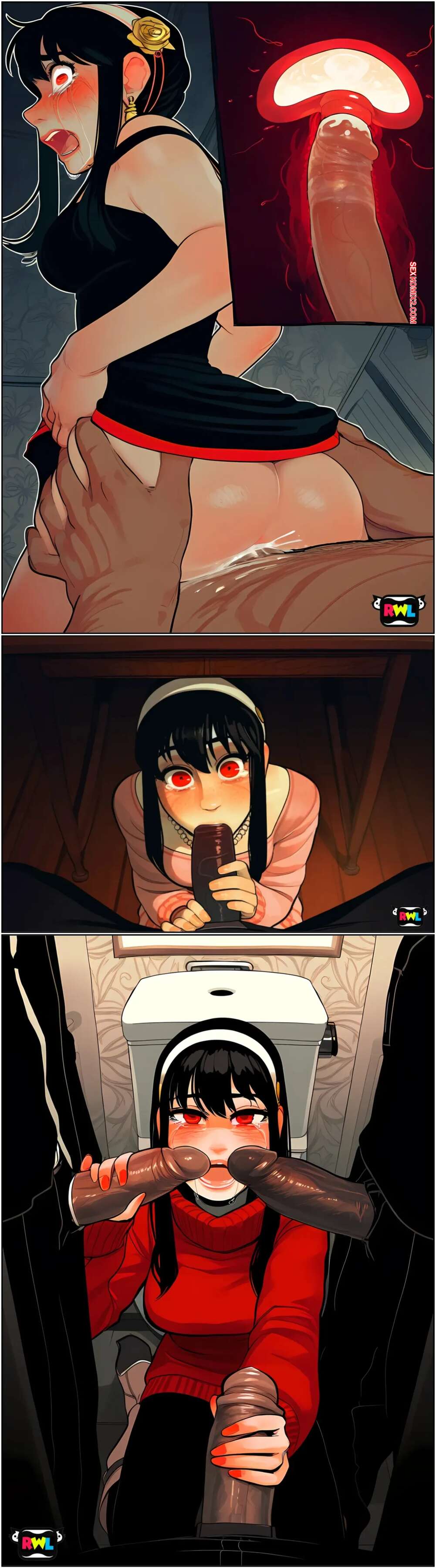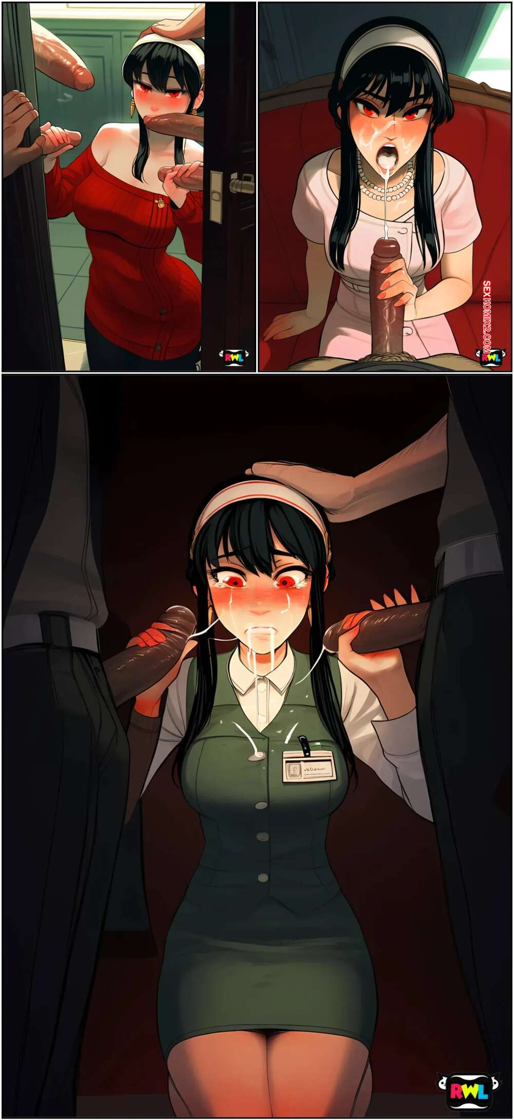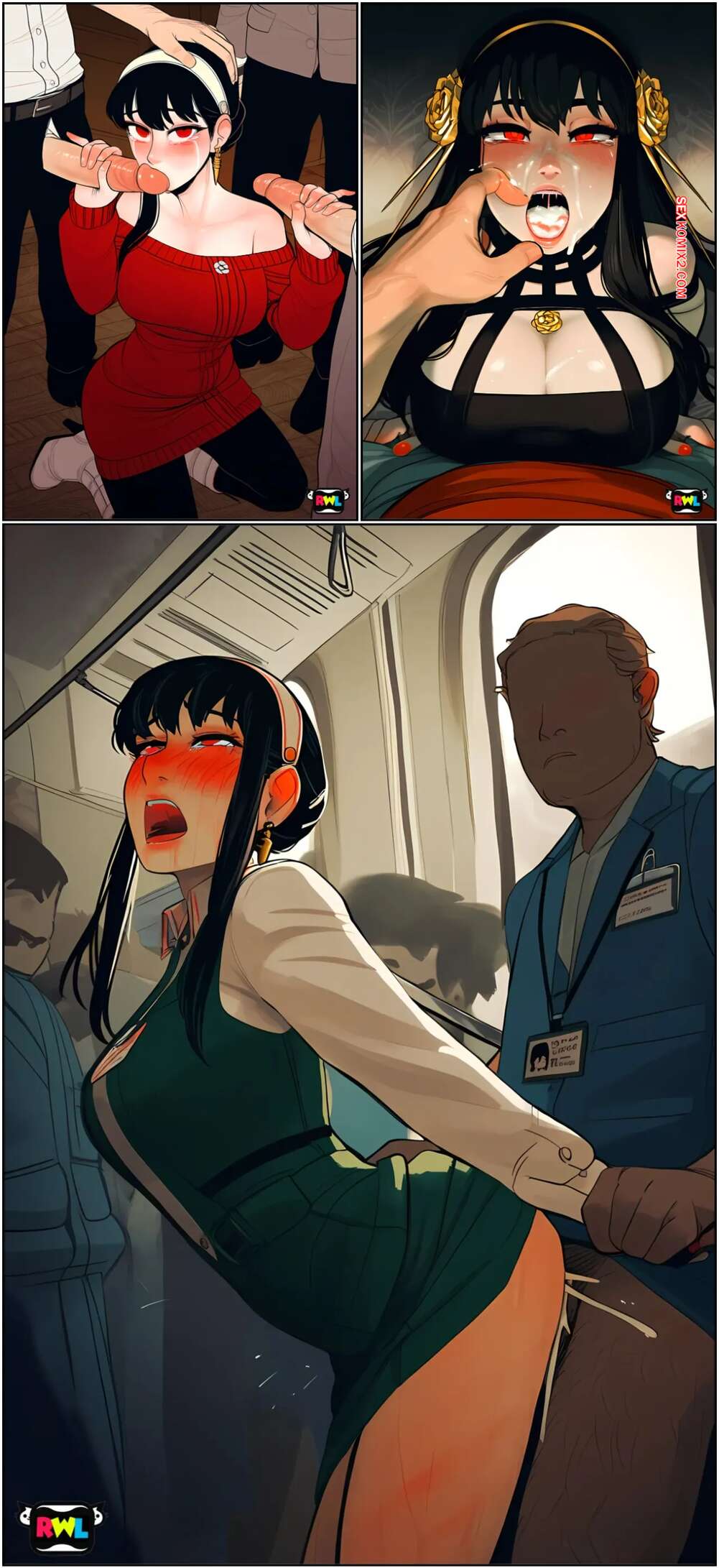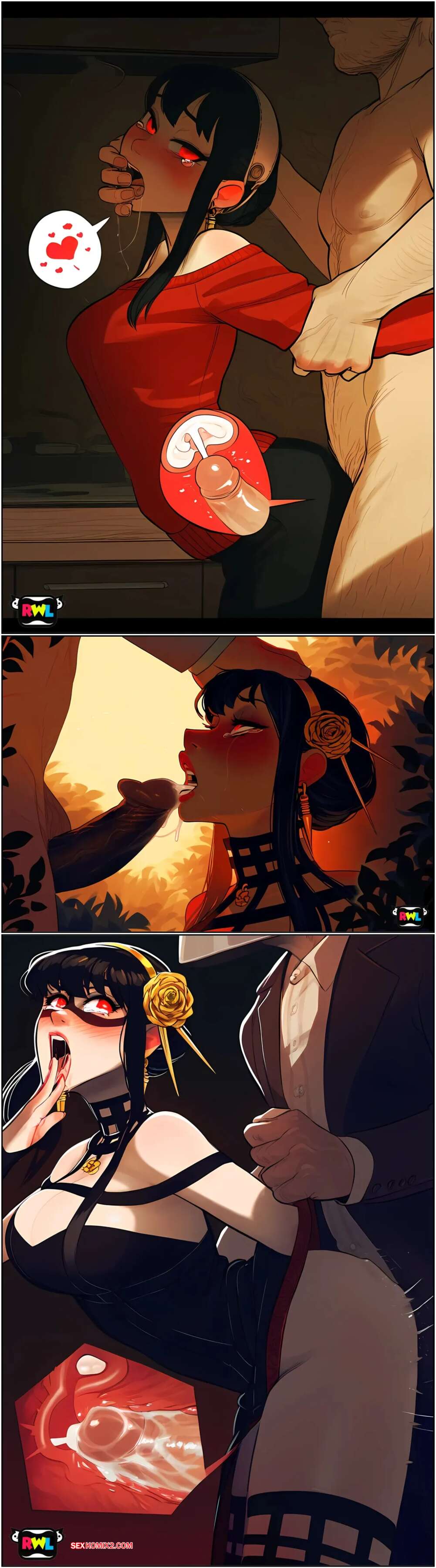Порно комикс Yor Forger. RWL Красотка Йор обожает трахаться. Девушка раздевается перед парнями и с большим удовольствием сосет их большие члены, после чего раздвигает ножки и дает себя выебать.