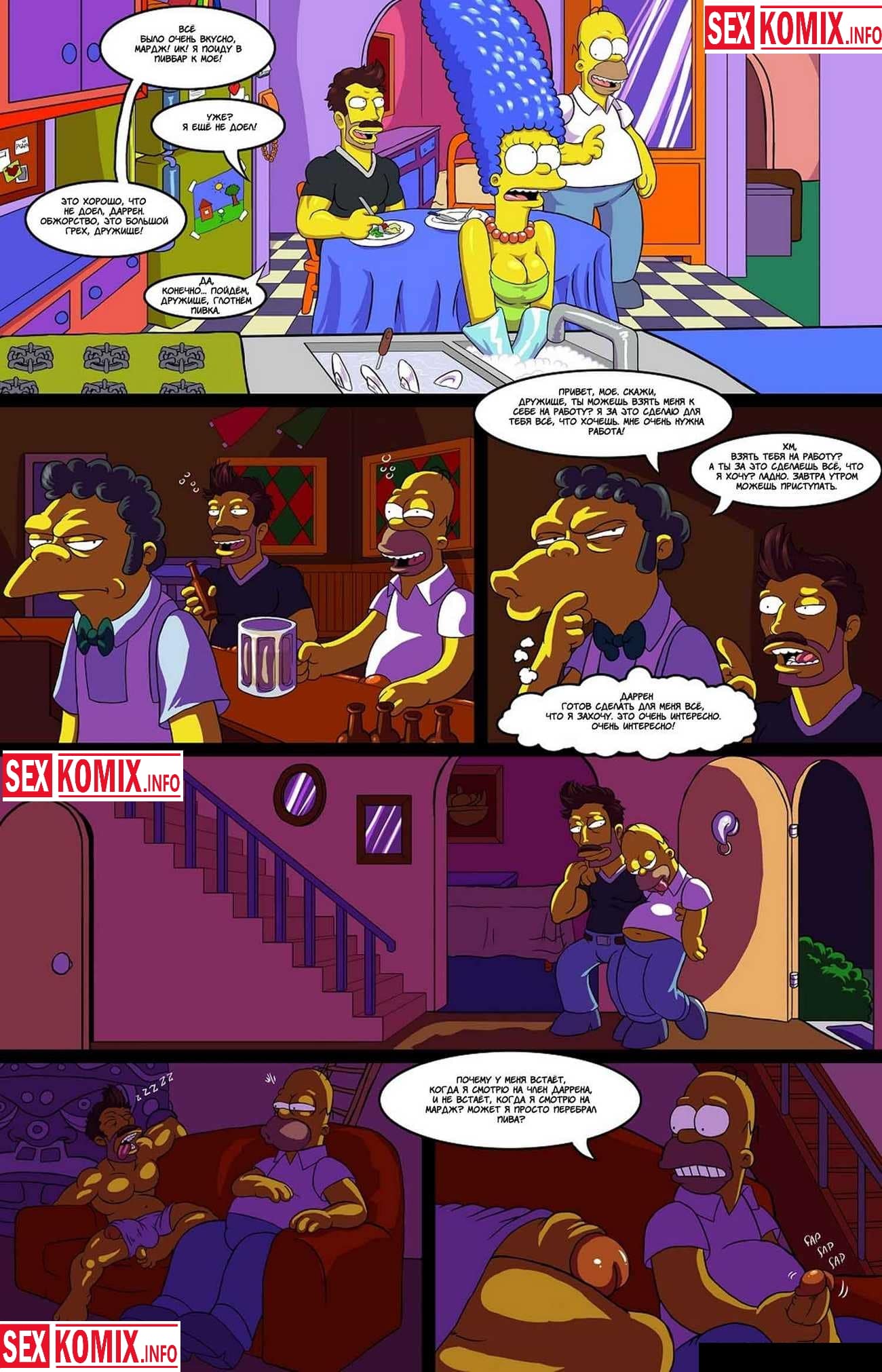 Порно комикс Приключения Даррена. Так бездомный и к тому же безработный проходимец по имени Даррен, втёрся в доверие к любителю пива, полнотелому Гомеру и набился к нему в гости на проживание. Гомер был счастлив от своего бескорыстного поступка, и даже не подозревал, какого козла он сам пустил в свой «семейный огород». Его женушка Мардж страшно негодовала, что в их доме завёлся нищий бродяга, но вскоре женщина напрочь изменила своё мнение…