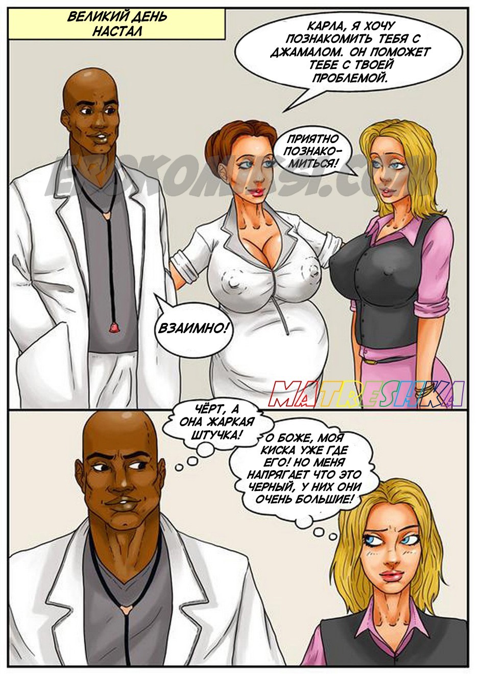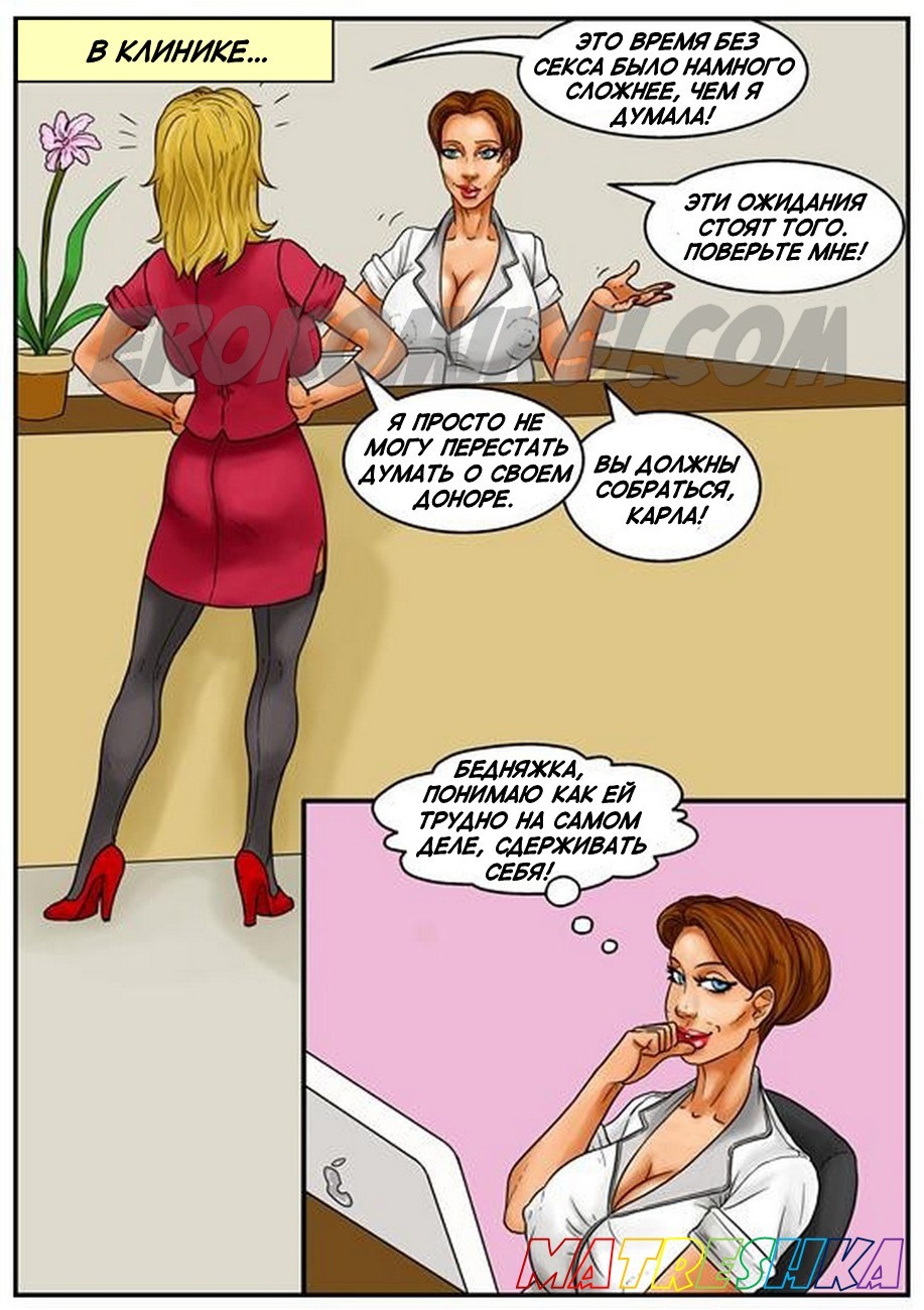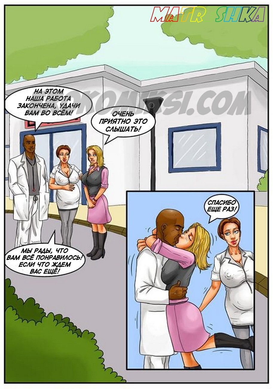 Порно комиксы на русском языке .Банк спермы. Часть 2. В продолжении этого легендарного комикса вы увидите молодого чернокожего парня, который в первой части был обычным пареньком, но теперь он разбогател на том, что сдавал сперму. И вот в банк спермы пришла сексуальная блондинка с большими сиськами и захотела воспользоваться услугами этого заведения. По правилам банка девушка может видеть донора, когда она увидела фотографии чернокожего гиганта, то очень сильно возбудилась, и её захотелось с ним потрахаться. У администратора выяснила адрес и номер телефона этого парня, созвонилась с ним и приехала к нему в гости, чтобы заняться сексом.