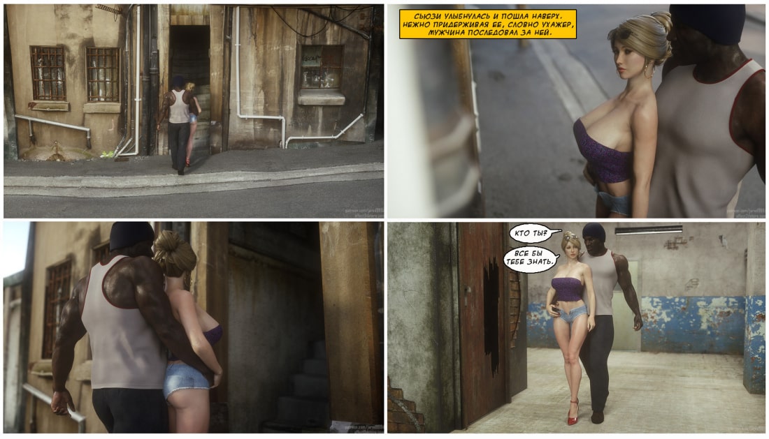 Порно комиксы 3 д. Дикарка Сью. Неуправляемая страсть. Молоденькая блондиночка гуляла по неблагополучным у району города, и зашла в тёмный переулок, где тусовались чернокожие парни. Один из парней последовал за ней, и попытался познакомиться. Девушка не была против, ведь именно для этого она туда и пришла. После недолгого диалога, девушка сама потащила парня заняться с ним сексом. Но поскольку в районе не было ничего приличного, они пошли в ближайший туалет. Который выглядел не очень-то чистым, но девушку уже ничего не могло остановить. Она была возбуждена и плавочки очень сильно намокли.