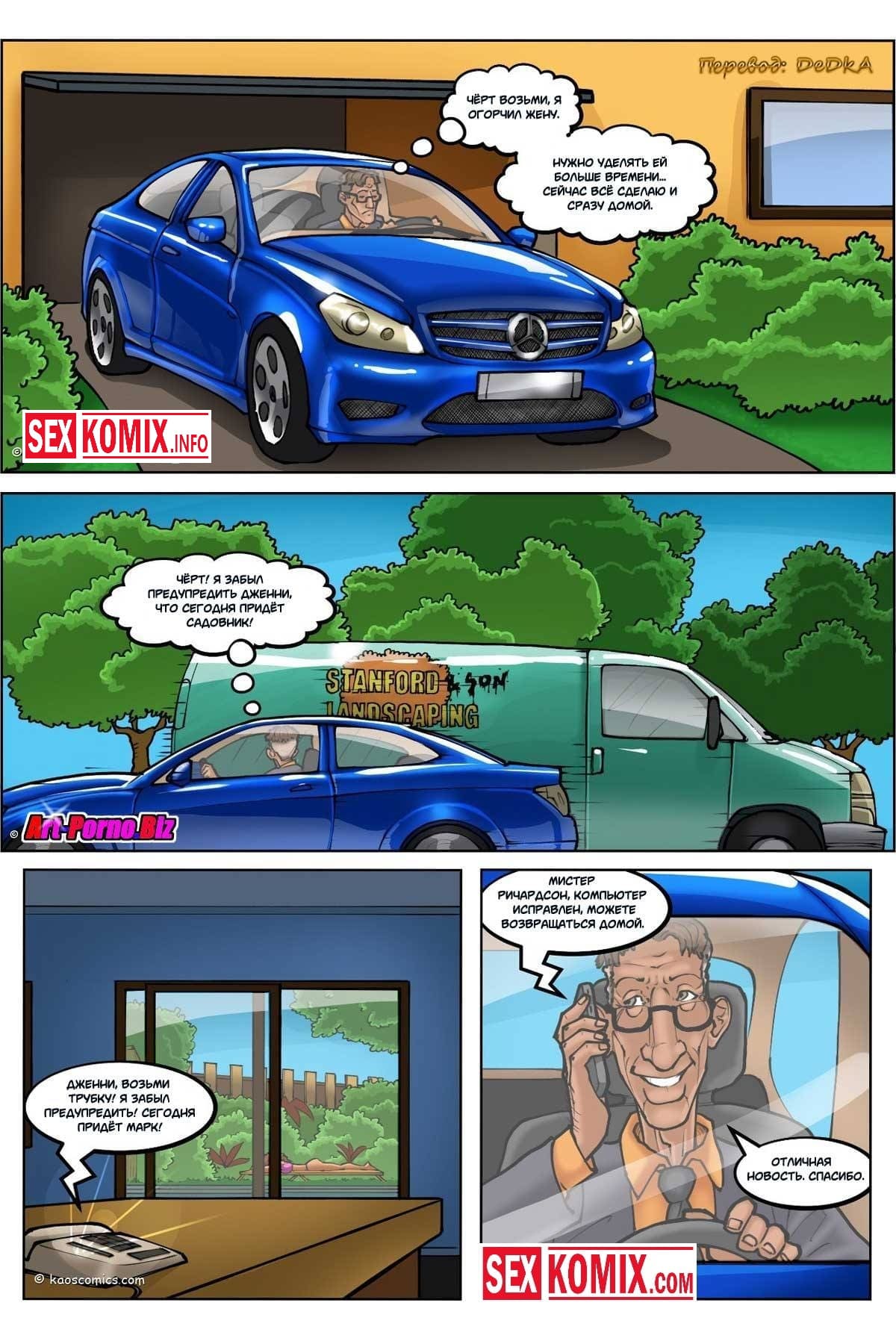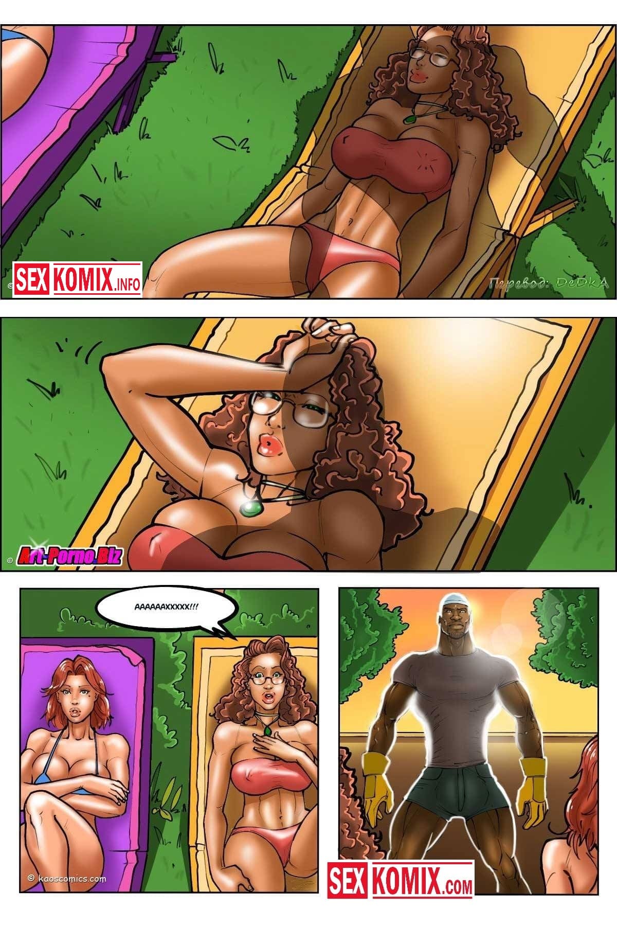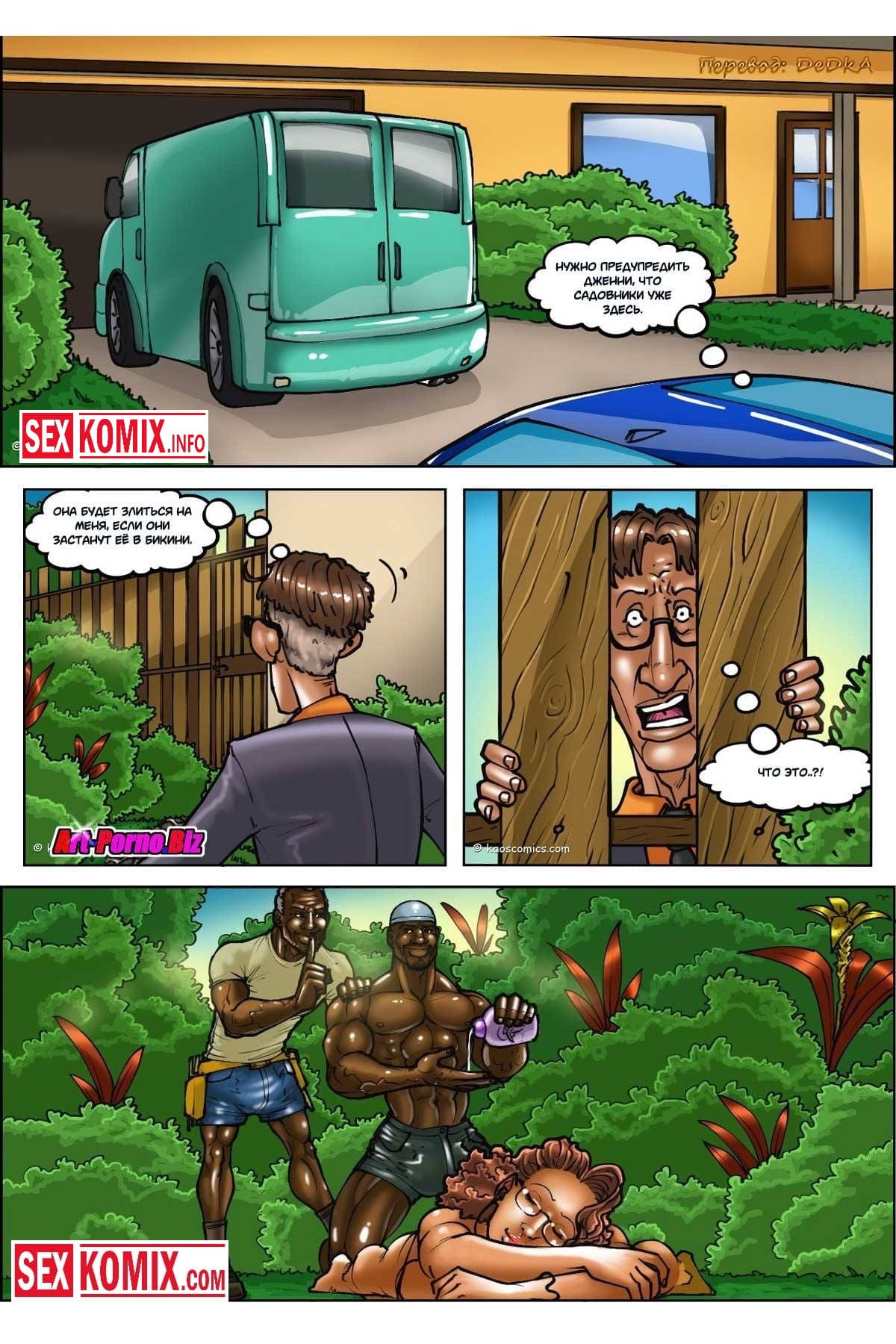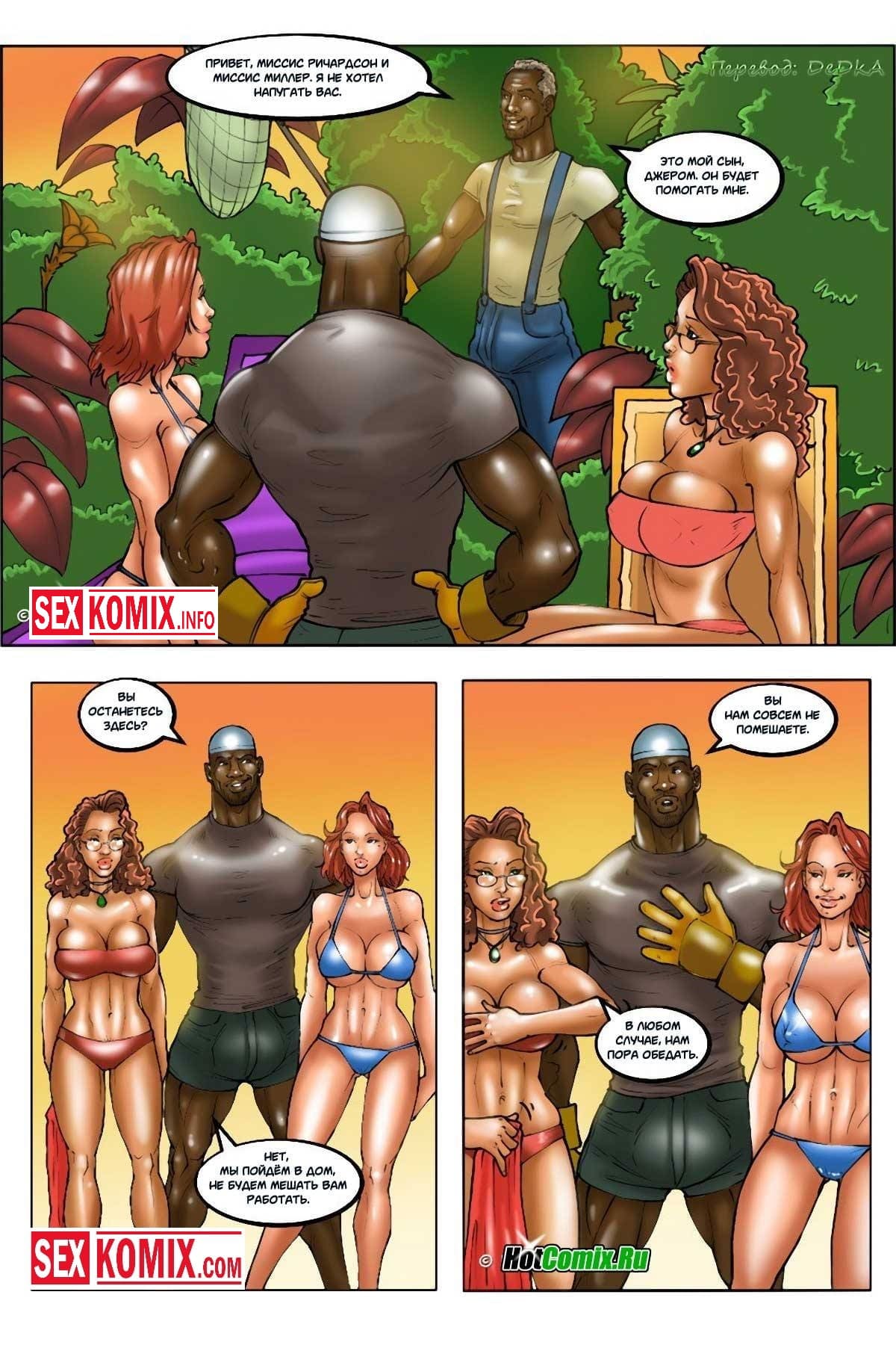 Порно комик Белые жены и черные садовники. Часть 1. Две пышногрудые блондинки, загорали возле бассейна жарким летним днём. Но они даже не подозревали, что именно сегодня работают два чернокожих садовника, которых нанял богатый муж, одной из девушек. Парни постоянно выглядывали из кустов, и поглядывали за красотками, которые красиво расположились на шезлонгах в одних купальниках. Девушки заметили их и подозревали к себе для, того чтобы с ними познакомиться. Они заметили через шорты, что у парней большие члены и знакомство стало ещё ближе.