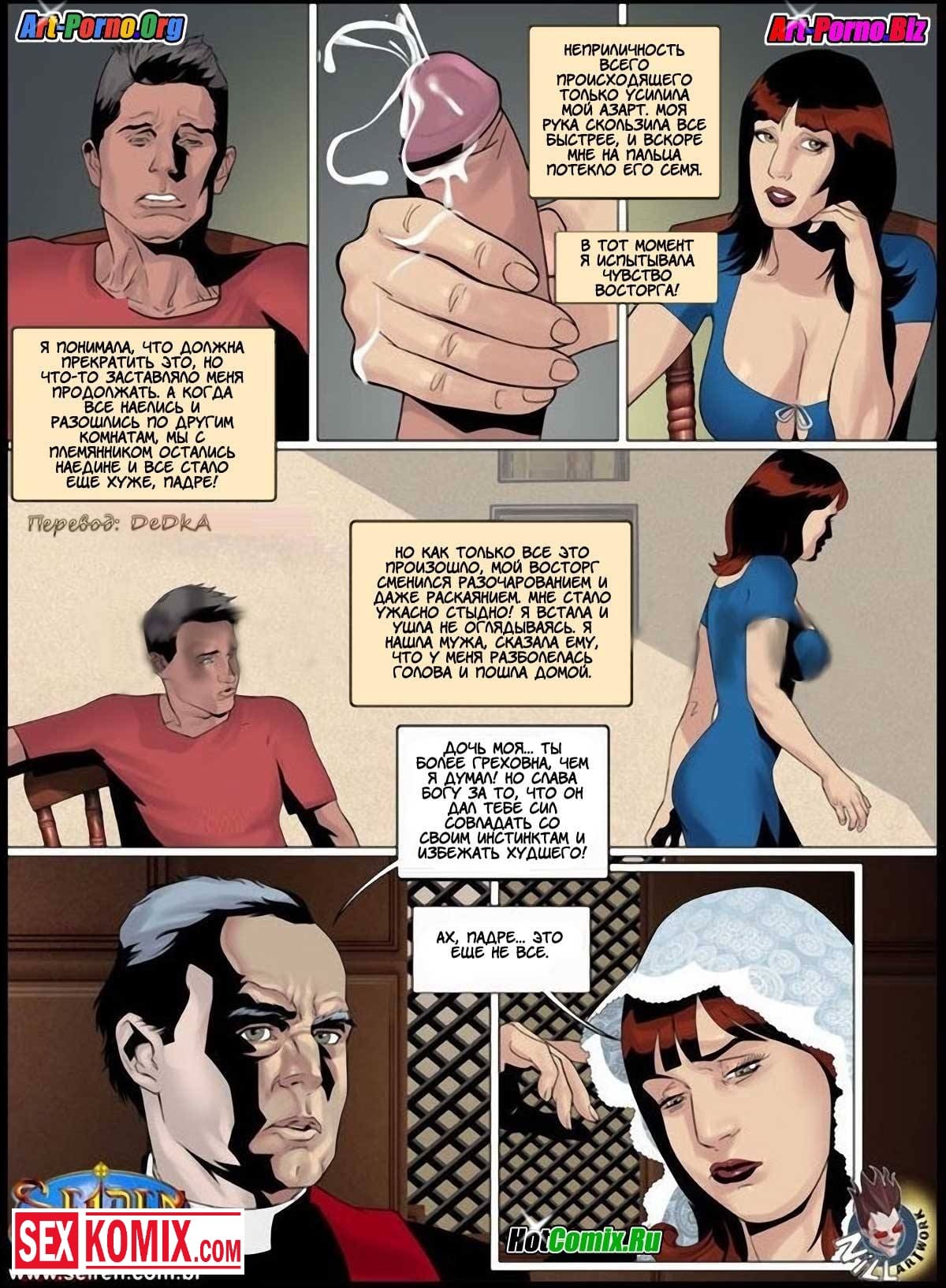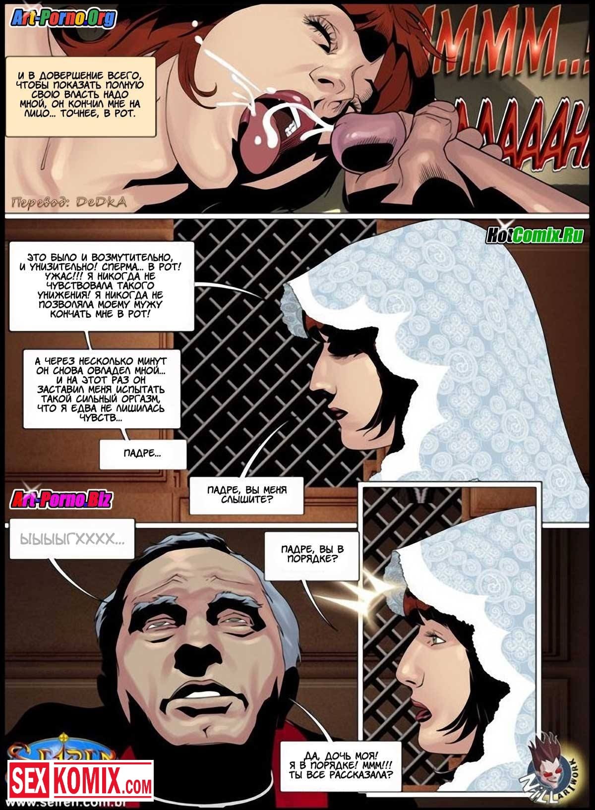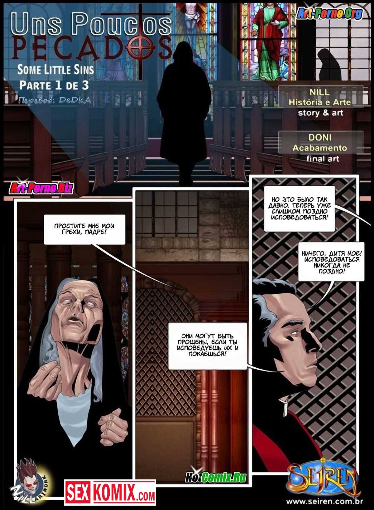 Порно комиксы новинки. Несколько маленьких грешков. Часть 1. Девушка приходит в церковь чтобы исповедаться. В исповедальной комнате она рассказывает святому отцу о том как у неё был секс с молодым мужчиной. Она описывает все подробности: сначала как они познакомились на вечеринке, потом они поднялись в комнату на втором этаже чтобы просто побеседовать. Но мужчина начал нагло приставать к ней. Когда она это всё рассказывает святому отцу она очень сильно возбуждается и начинает мастурбировать прямо в исповедальной комнате. Она в подробностях описывает как сосала член и как этот мужчина трахал её.