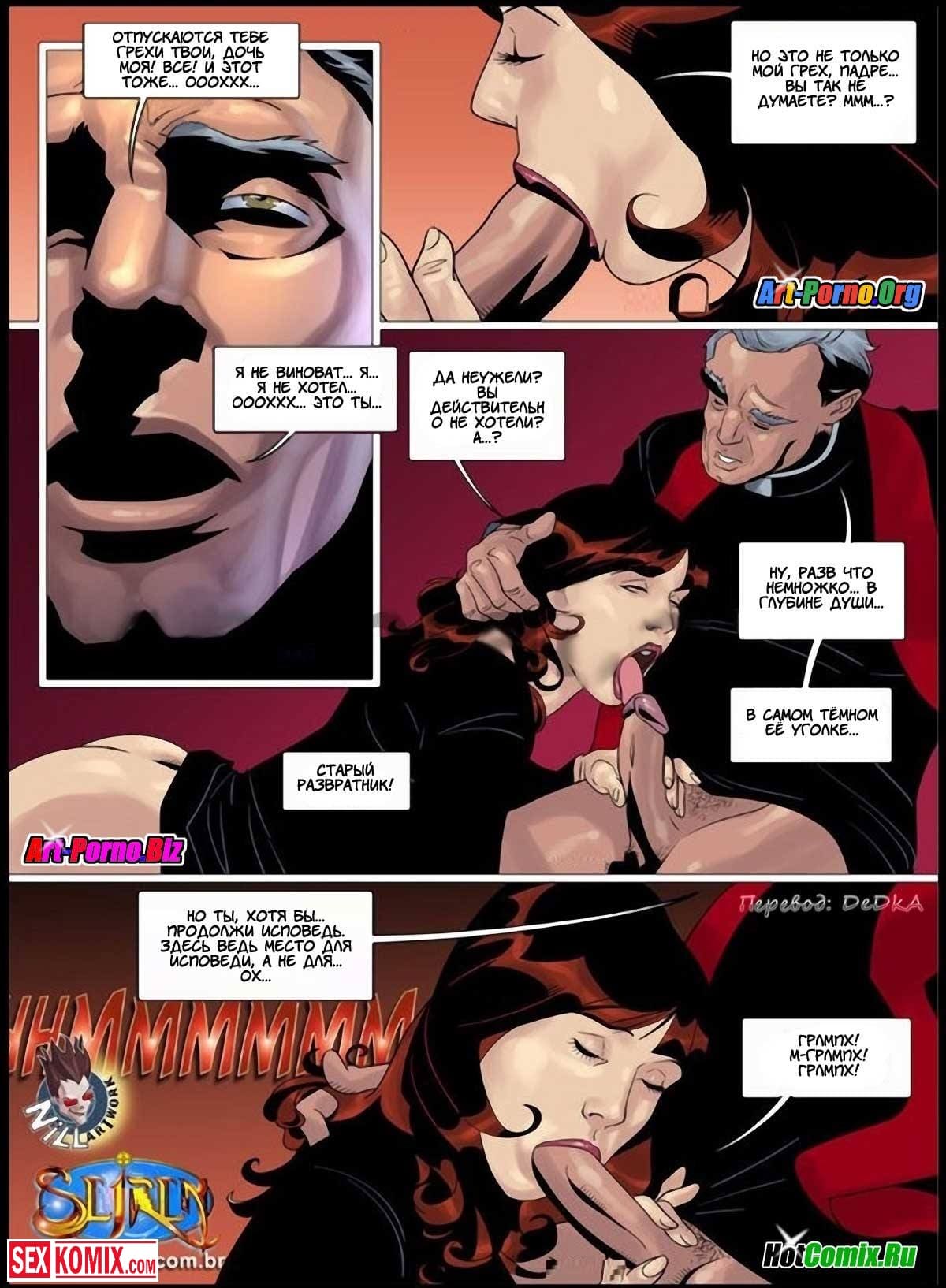 Порно комикс Несколько маленьких грешков. Часть 3. Очень сексуальная брюнетка пришла на исповедь в церковь и когда священник спросил у неё, что она совершила девушка начала рассказывать о своих сексуальных похождениях, о том как она изменяла мужу с разными мужчинами с разных профессий. От этих рассказов у священника встал член, он не мог ничего с собой поделать, его мужское нутро вырвалась наружу и женщина почувствовала это в голосе. Она вышла из своей кабинки и перешла в его, он сидел уже с членом в руке. Она сделала ему сочный миньет, от которого у священника чуть не выскочило сердце.
